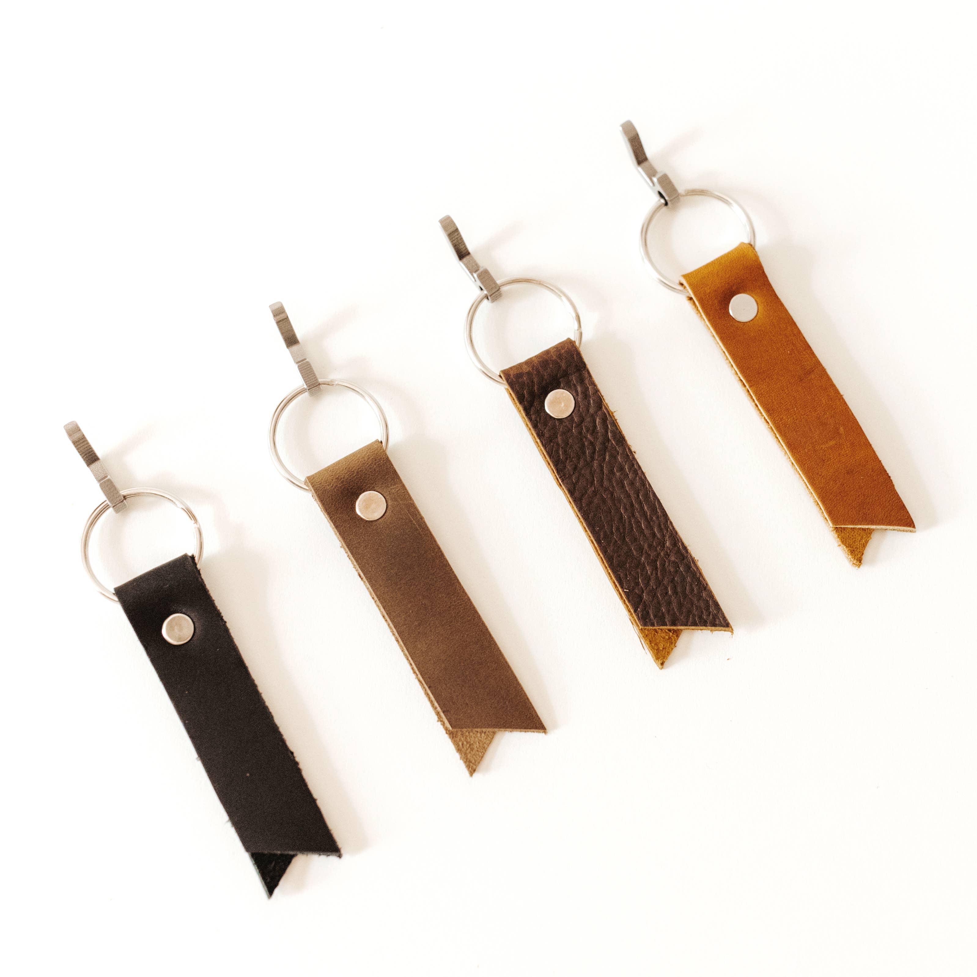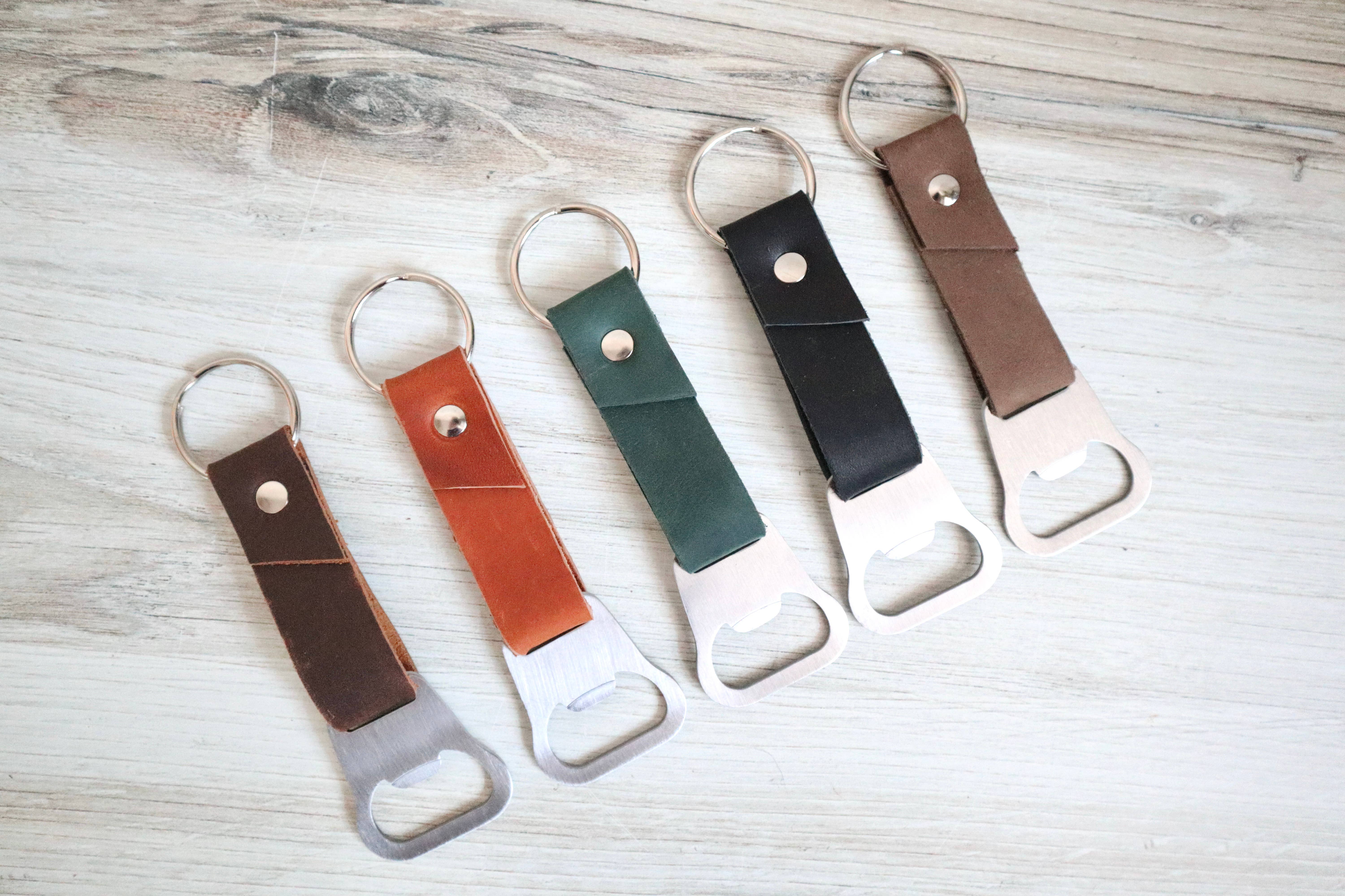 The orginal bottle opener keychain is 100% handmade. No laser cutters are used in our process! This bottle opener is the perfect gift for the special guy in our life, groomsman or any chick on the go. You can personalize the bottle opener for a custom gift or memento. Your custom text is handstamp for a unique look. Expect the leather on your keychain to soften and age beautifully with use. Each piece of leather is unique and has natural variations in color and texture for a true one of a kind piece. Choose between custom text of 1 or 2 lines. Each line can hold 9 characters for a max of 18 characters on 2 lines. Each letter and number are hand stamped for a one-of-a-kind handmade item. Total length: 5" Width of leather strap: 3/4" Bottle opener: 1 1/2" L x 1 5/8" W Materials: Brushed silver bottle opener 32mm sturdy split ring Silver double capped rivet.