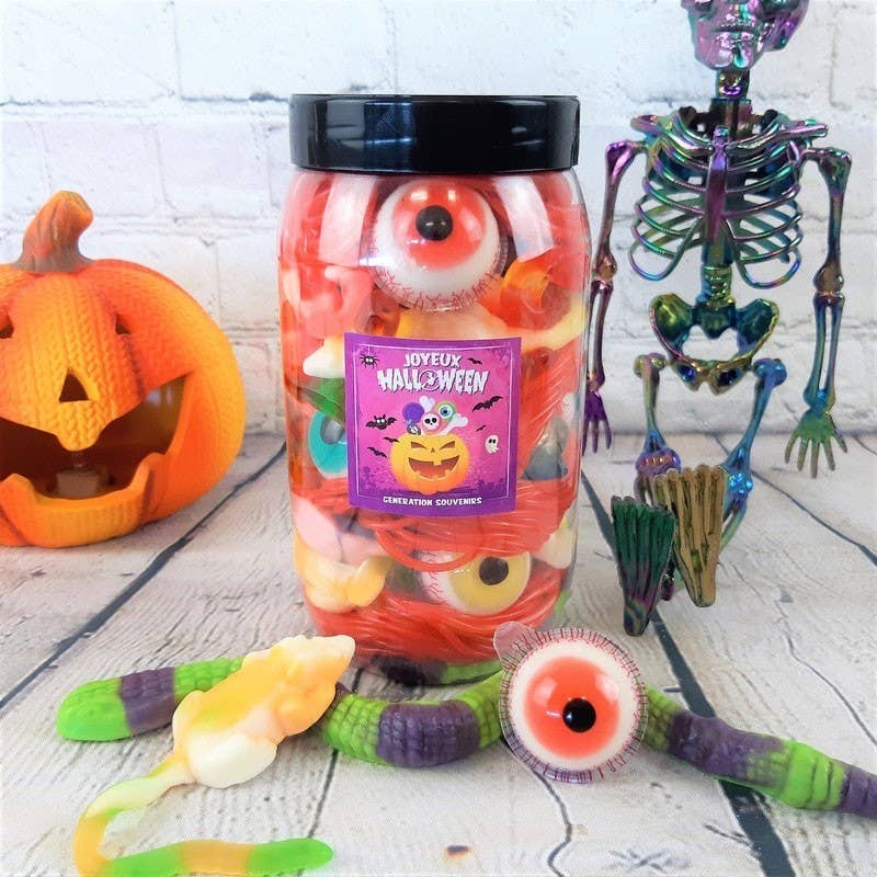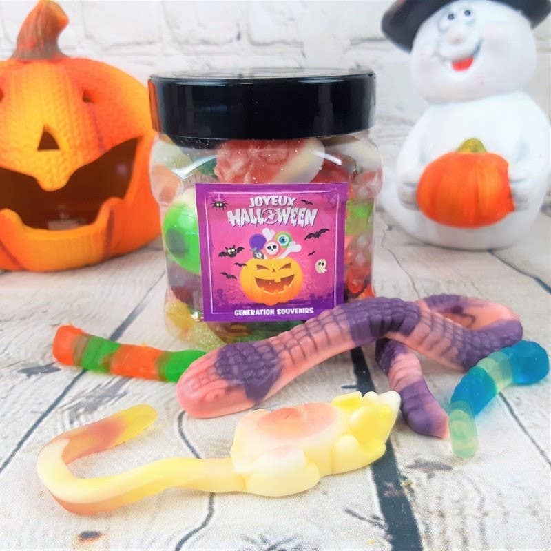 Halloween candy box filled with awful monster candies. On the menu: a globose eye candy, a slimy snake, vampire teeth, skulls, mice, witches, pumpkins, earthworms, and even horror-themed chewing gum balls. Discover our entire selection of Candy Boxes! Product characteristics: Halloween candy box Box material: plastic Dimensions of the gourmet box: 12 cm high and 11 cm in diameter. Total weight: about 650g Price per kilo: €23. Random candy patterns. Non-contractual photos. Storage: keep in a cool and dry place. Nutritional values per 100 g: energy 1373 kJ/323 kcal, fat 0 g, of which saturated fatty acids 0 g, carbohydrates 76 g, of which sugars 52 g, protein 6 g, salt 0.10 g. Legal info: Generation Souvenirs - 172 chemin de camole 83440 Montauroux. We guarantee a best-before date (DLC) of several weeks.