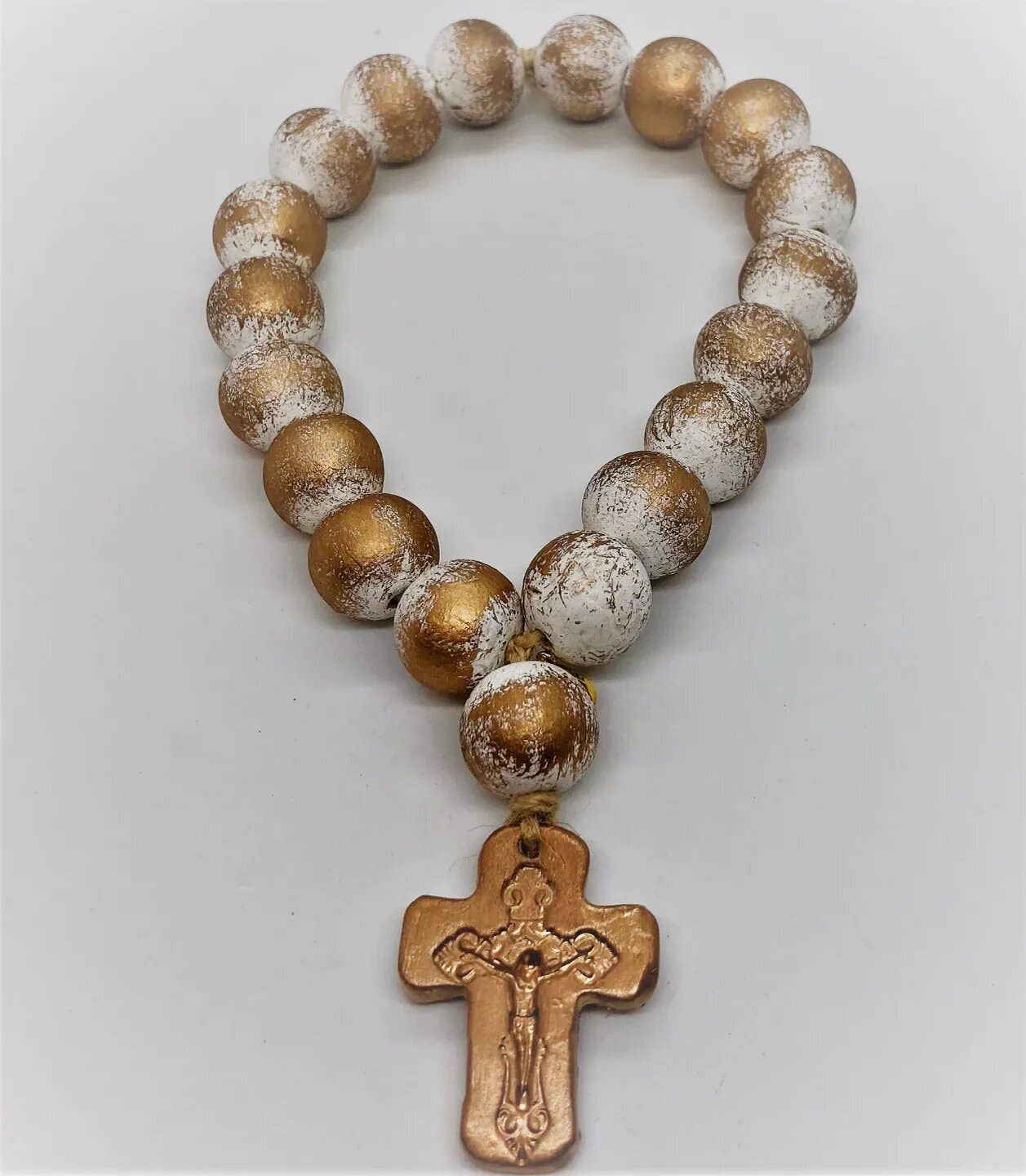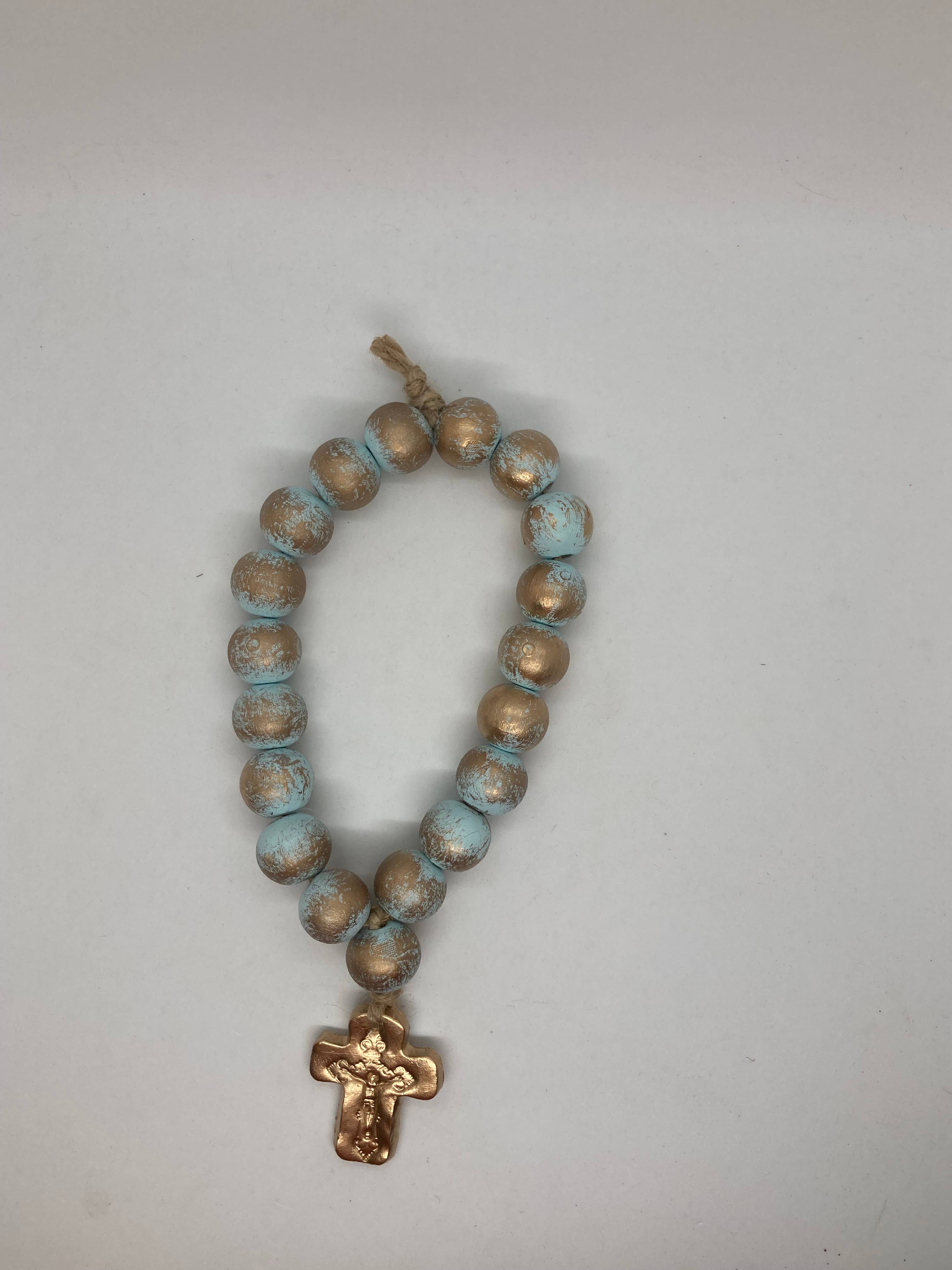 The CAR ROSARY has 10 wooden beads (20 mm) and 1 (25mm), a clay cross with a crucifix blessed by the Pope imprinted, strung with extra twine to hang from the rearview mirror in your vehicle. Why 11 Beads? The solid color gold bead is for The Lords Prayer and each of the 10 gold accented beads is a Hail Mary Prayer. Each Car Rosary comes packaged with a tag: "May the Lord protect you from all accidents, incidents and recklessness. We pray in His name Amen"