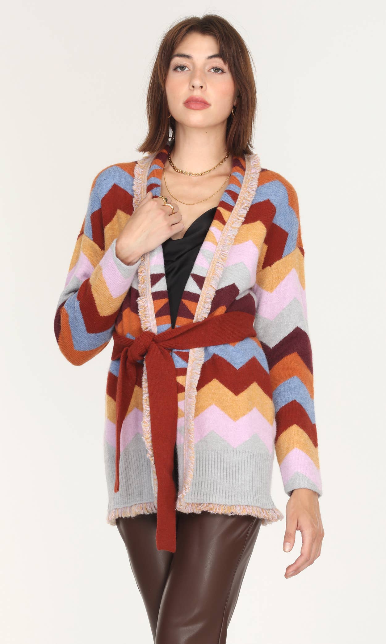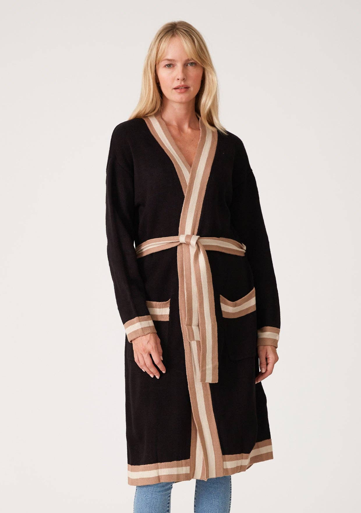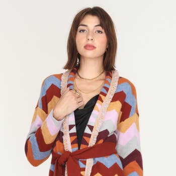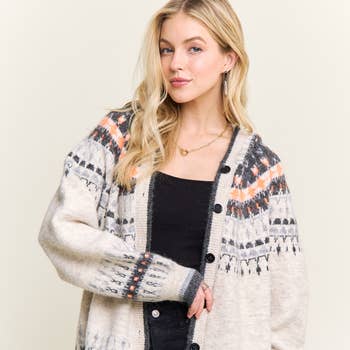 Available in XS and XL. Extended sizing available upon request. Embrace the fall season with our long sleeve shawl collar tribal cardigan, featuring two handy patch pockets and contrasting trims. This cozy cardigan is designed with knit cuffs, making it perfect for layering in cooler weather.