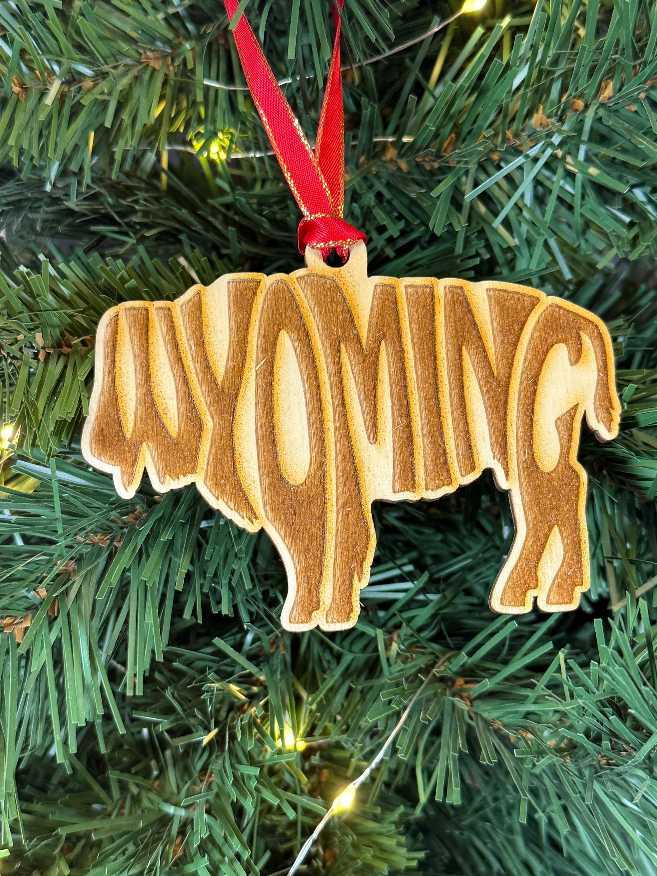 This wooden ornament measures 3" and includes a hang tag & red string for hanging. These wooden ornaments are laser cut and engraved from 1/8" solid alder wood - no plywood or veneer or pressboard.