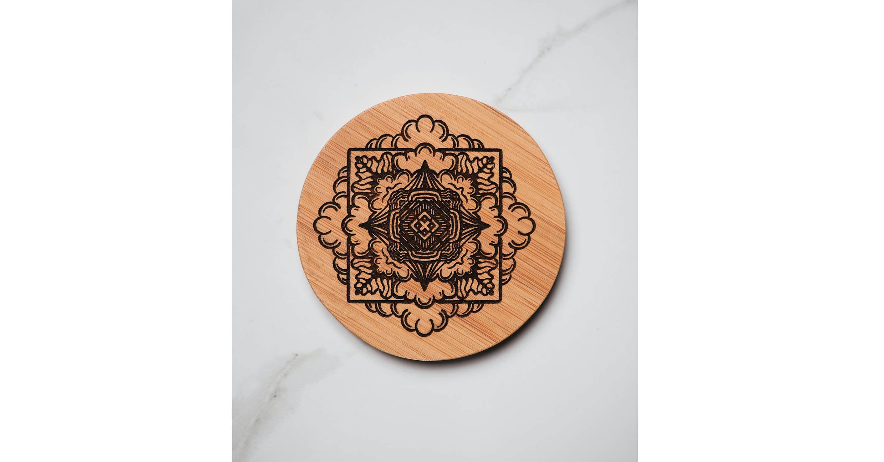 This set of four 4" round coasters features a stylish blend of black marble and acacia wood, each with four padded feet. Though designed primarily as coasters, they also serve as elegant mini cheese or snack servers. Personalization available. Packaged in a gift box, this set is a perfect housewarming or wedding gift. It complements beautifully with our Black Marble and Half Acacia Wood Round (SKU 016003) and Black Marble Stripe and Acacia Wood Round (SKU 016027) boards.