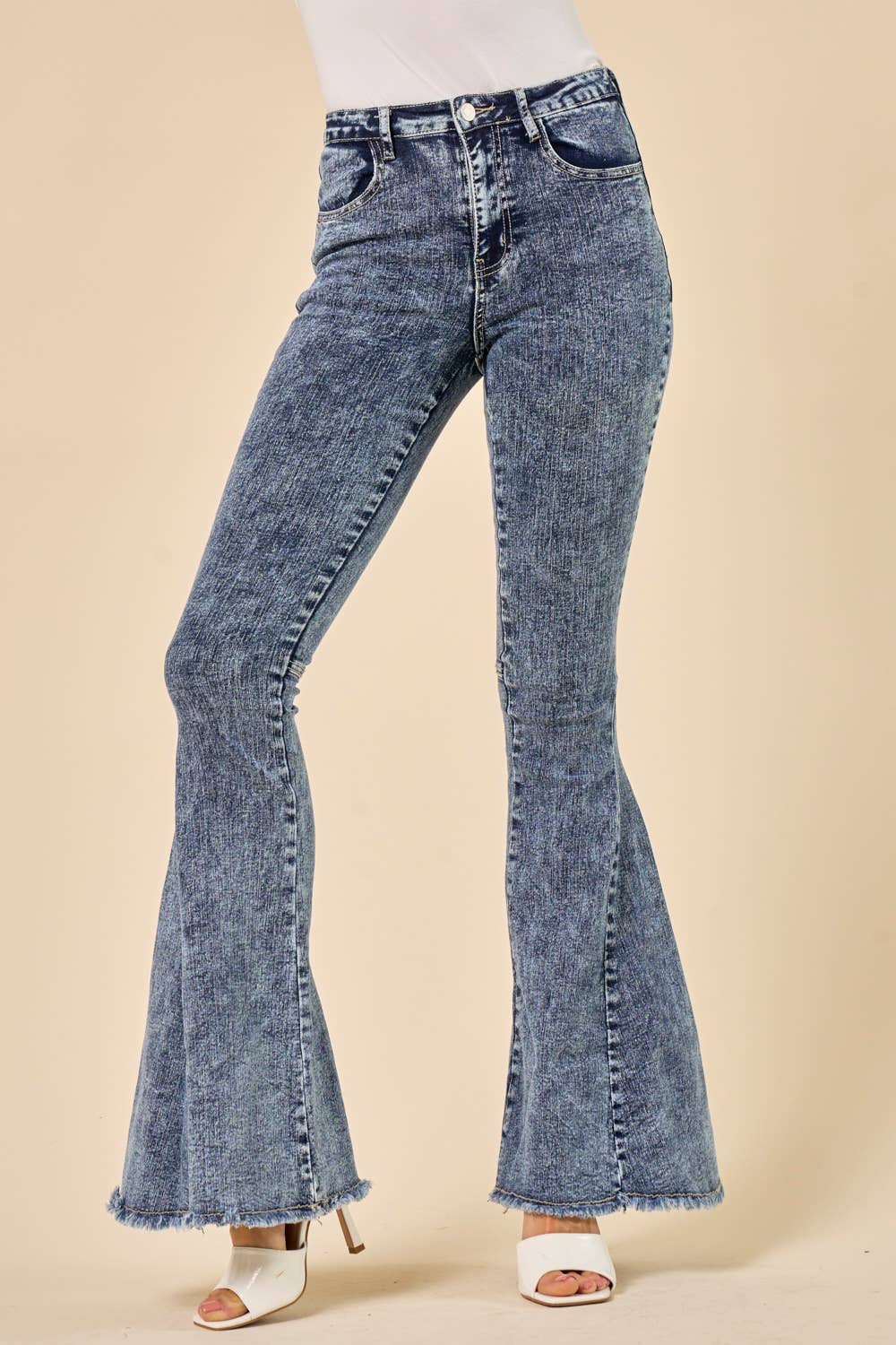KIWI Women's Clothing Denim pants Stretch denim Boot Cut Bell bottom fit Vintage light wash Beaded lace embellishment RUNS LARGE at the hips and front Fall Clothing Model is 5 ft 8 in, wearing a Small. Bust: 32 in Waist: 24 in Hips: 34 in Product ID: IP3253