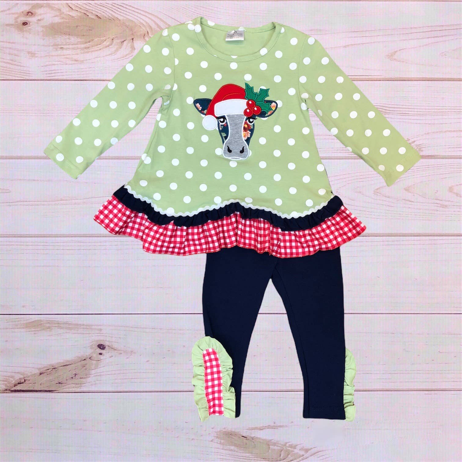 Green faux fur suspender skirt match long sleeve shirt girl Christmas outfits