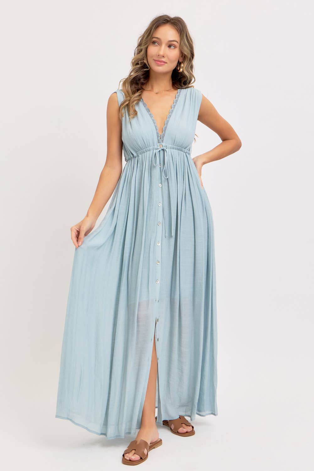 FD11820-P1465_2 Cotton linen blend maxi dress with a high slit. Model with BLACK is 5'9", Model in other colors is 5'10" and Model in NAVY is 5'6". They are wearing size Small. - Princess seam - Shoulder straps with adjustable hidden button closures - Smocked back panel - Hidden side zipper closure - A line skirt - Side high slit - Circle buckle belt - Lined on the smocking panel on the back, IVORY and OATMEAL has addtional skirt lining and front chest self lining Shell: 70% Cotton, 30% Linen Lining: 100% Cotton Available By BLACK : In Stock BLUE HARBOR : Out of Stock IBIZA GREEN : In Stock IVORY : In Stock NAVY : 01/30/2026 OATMEAL : 01/30/2026