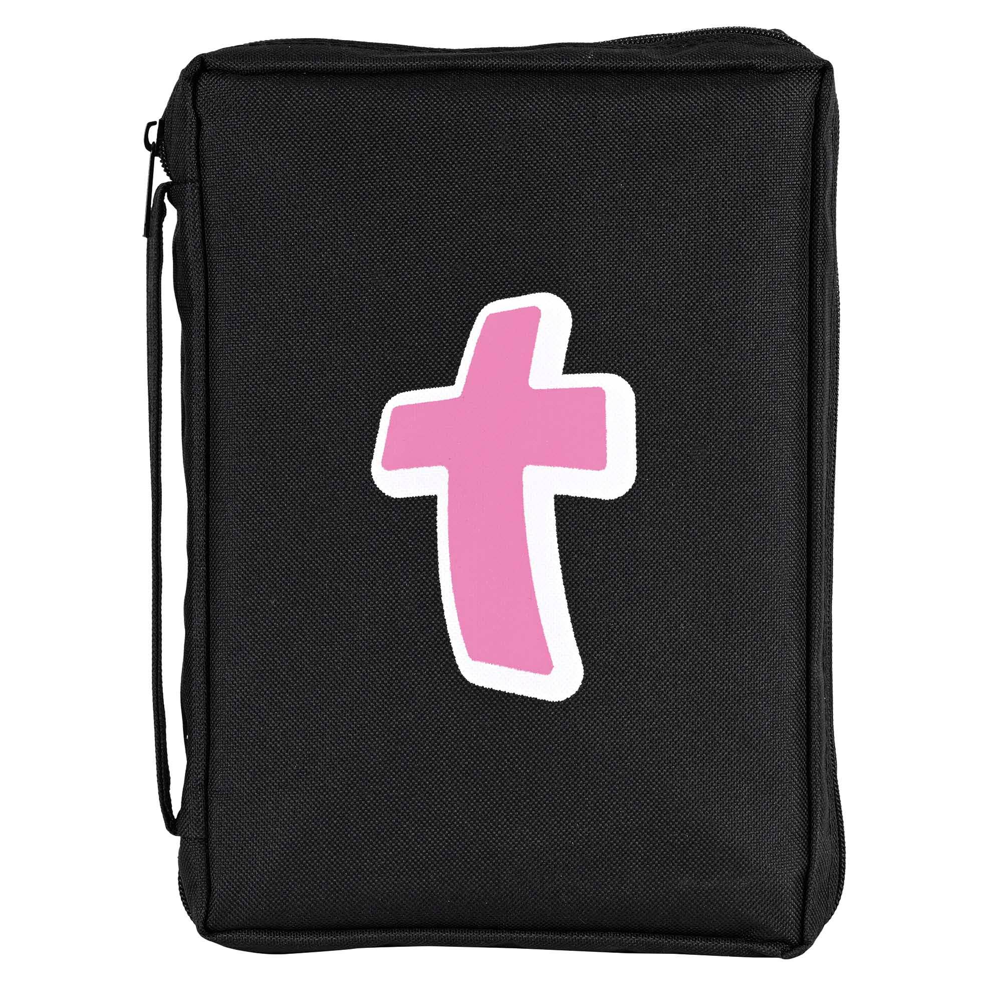 Black Bible Cover Made Of Rugged 600 Denier Polyester. Design Is Sublimated Into The Fabric For Richness And Durability. Other Great Features Include Side Handle, Non-Rusting, Self-Repairing Side Zipper With Spoon Style Cross Pull, Nylon Reinforced Stitching And Lay Flat Construction. This Is Our Medium Size And Fits A Bible Or Book Up To About 6 x 1 3/4 x 8 3/4. White And Teal Screenprinted Scripture Reads: Praise The Lord. Psalm 150:6.