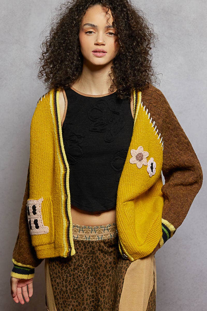 +SWEATER TOP +ABSTRACT +BUTTON UP +V-NECK MODEL IS WEARING S