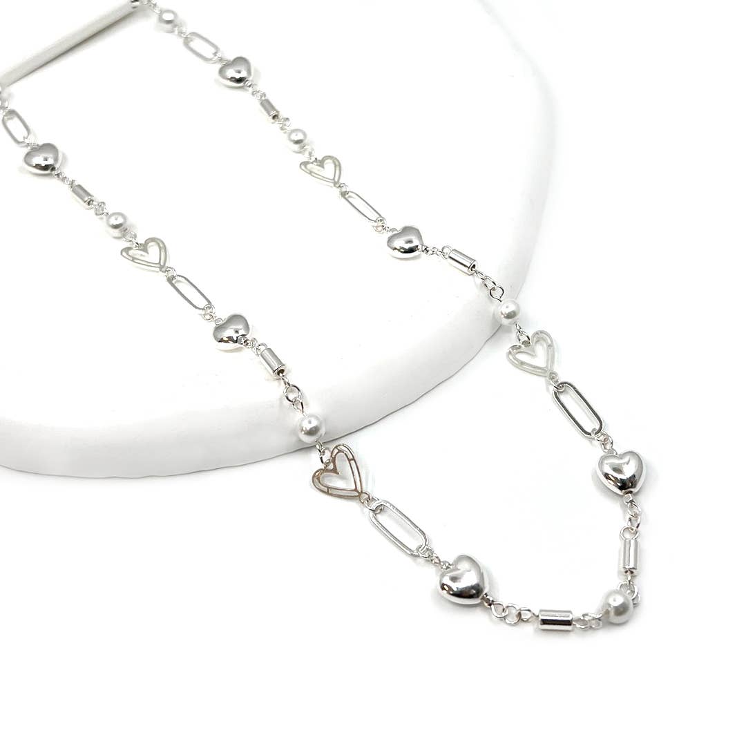 Freshwater Pearl Rosary with Heart Pendant Necklace black rhodium .925 sterling silver * Luxury trend jewelry for your everyday. * Set in black rhodium .925 sterling silver * Lobster closure * 16-18" adjustable chain * Heart Pendant: 12mm x 10mm * Freshwater pearl