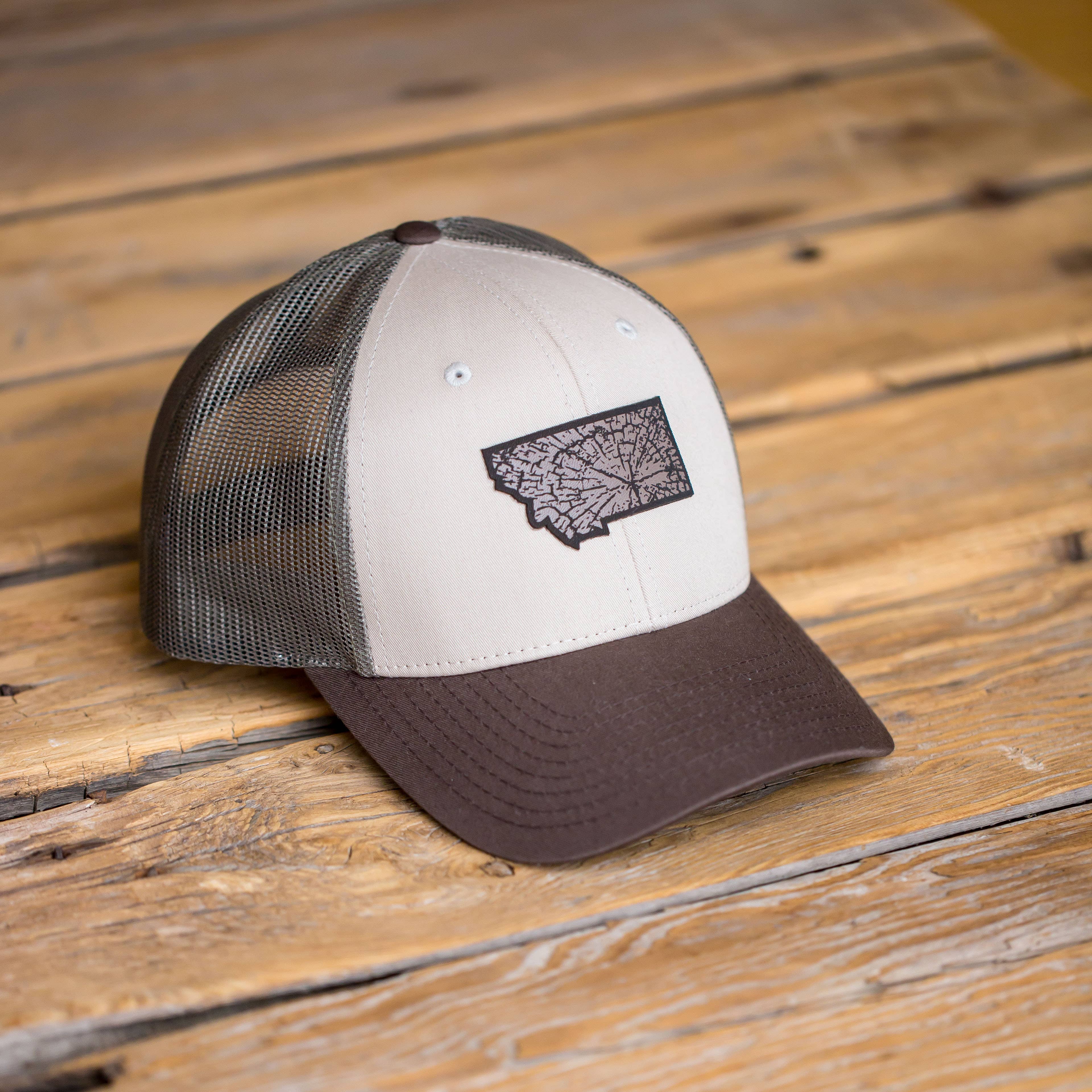 Richardson Snap Back Baseball Hat with leather engraved Patch Hat is a Richardson 112 Trucker Hat with adjustable strap. Leather is Laser engraved and made locally in Montana