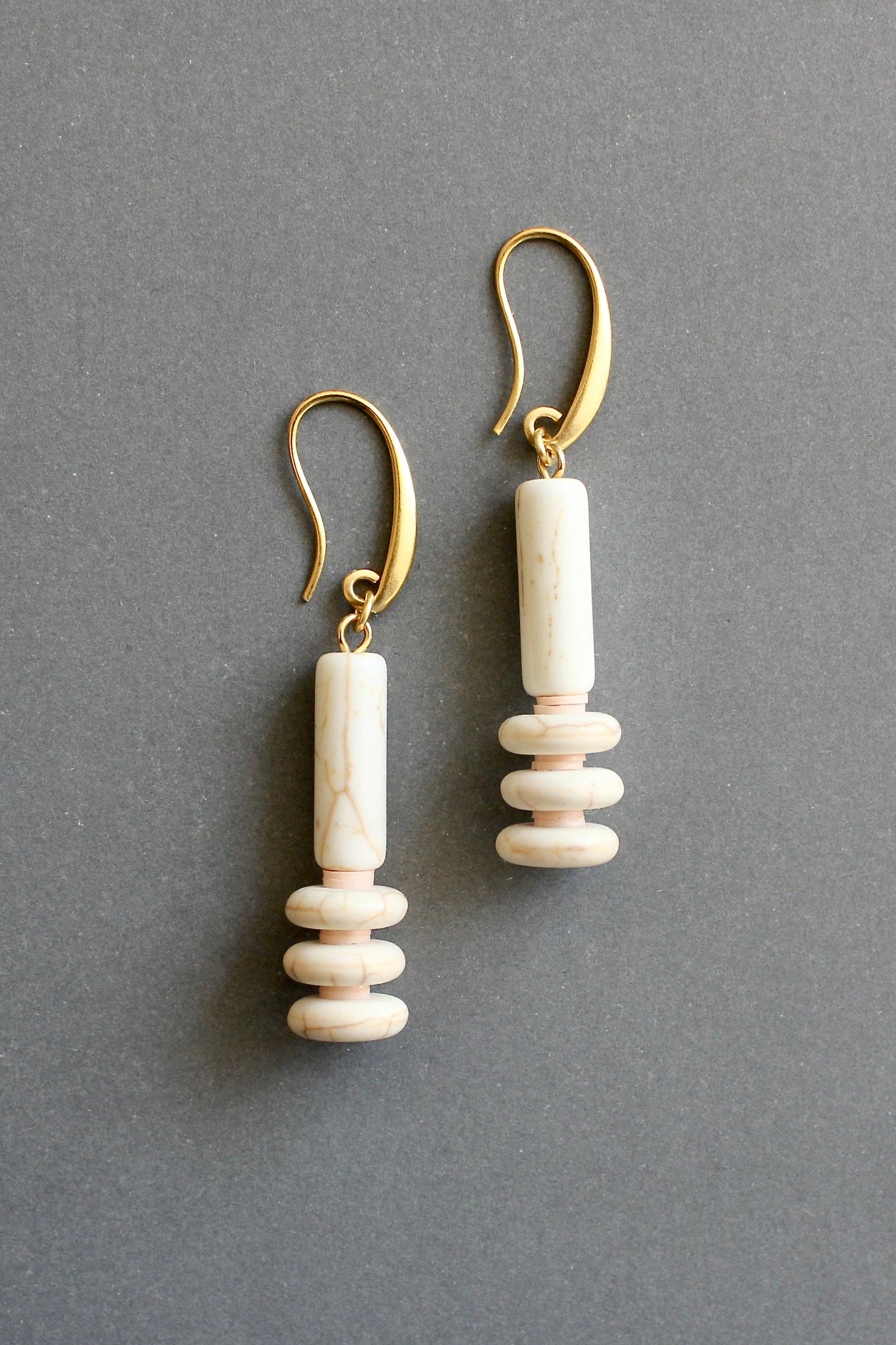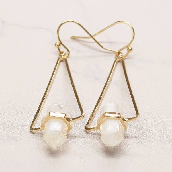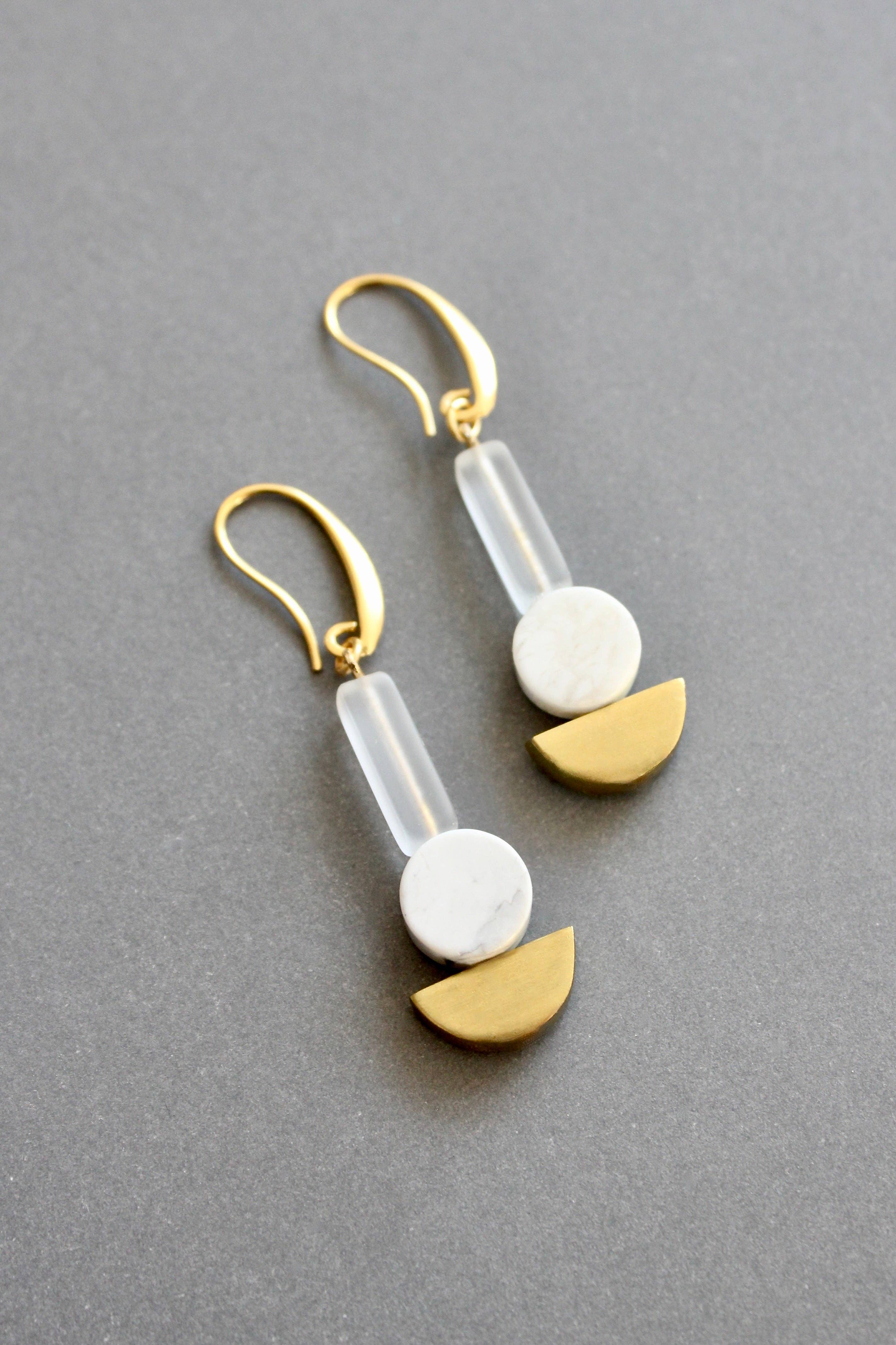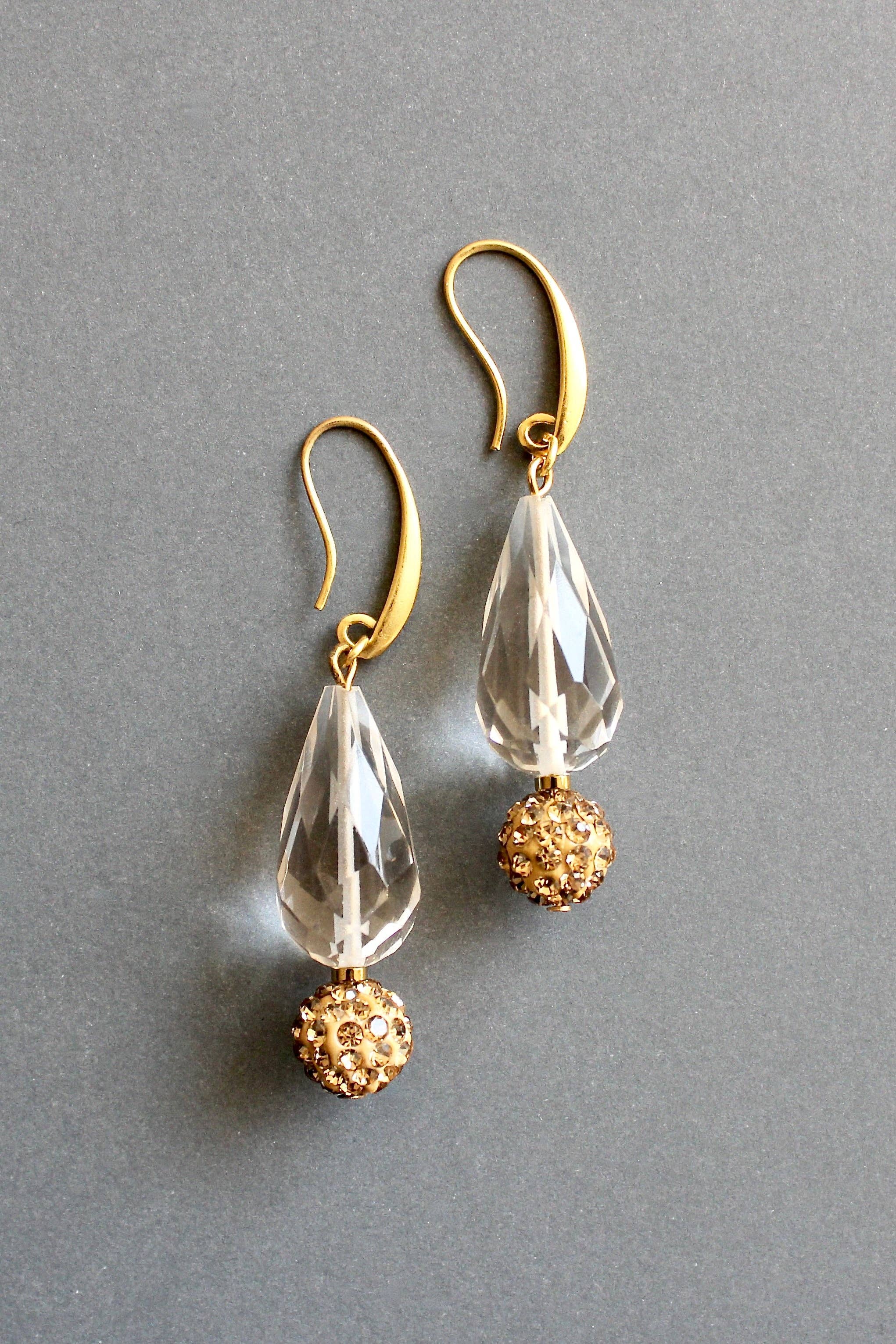 18k gold plated brass earrings with glass and brass. Each earring weighs .23oz and measures 2.5in from top of hook.