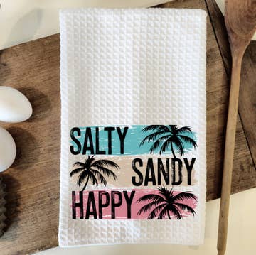 This beach-themed towel is the perfect addition to a beachside home and kitchen decor, and also makes a great housewarming gift. Choose pink or blue! - Measures approximately 16”x 24” - Made of 80% Polyester and 20% Polyamide. - Design is permanently printed - Individually packaged in cellophane sleeve and ready to be gifted - It is called a waffle weave because the towel has raised looped edges on the surface of the towel in the shape like that on a delicious Belgian Waffle. These “pockets'' that are created hold water while the surface of the cloth stays dry making it an exceptional drying towel! The raised looped edges on this lint free towel make it great for all around use, while also being great on glass.