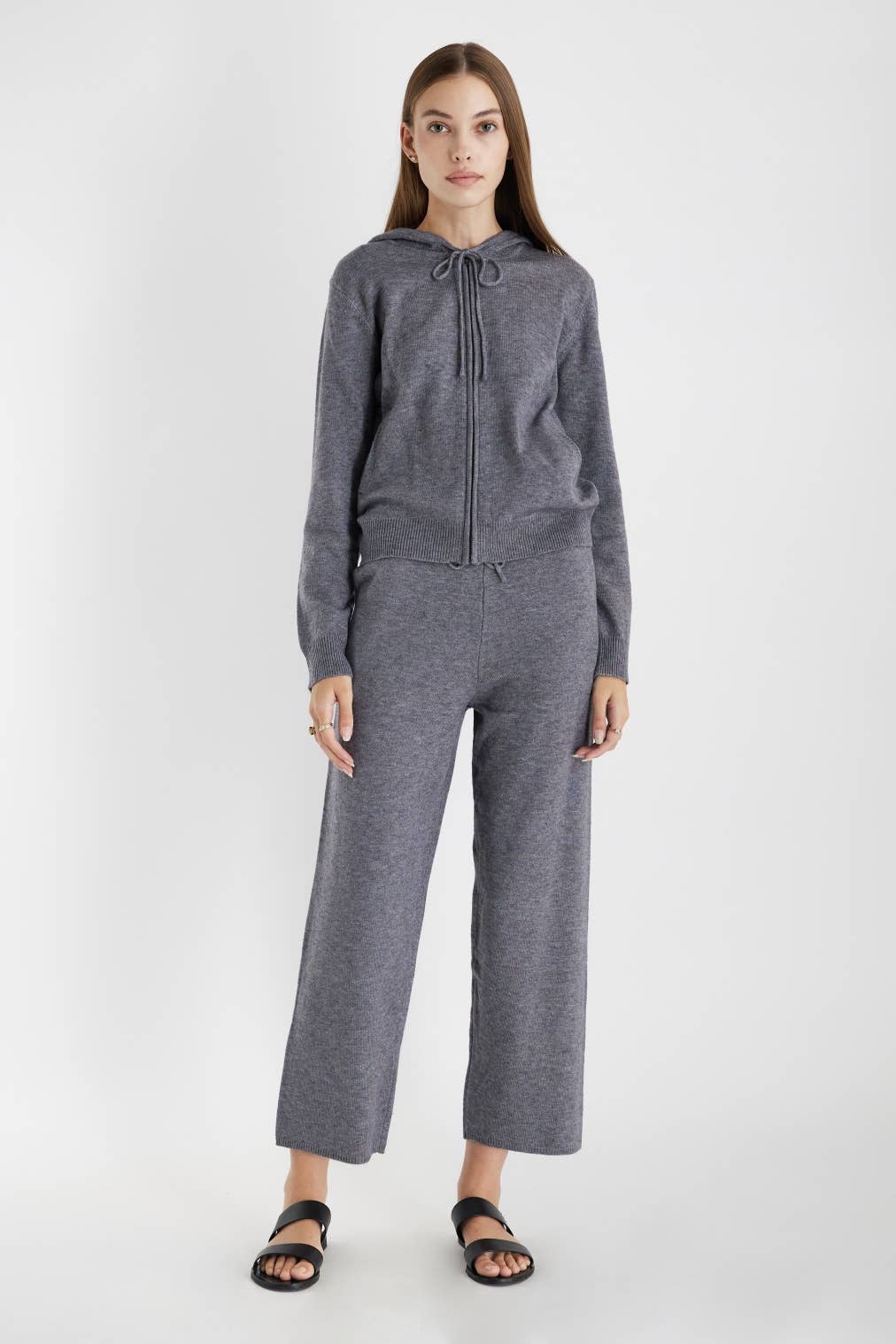 - Wide french terry pants w/ large satin bow ties - Elastic waistband - Large satin bow tie details on the sides - Front side pockets - Good stretch - Model size 5' 8" ( Wearing S size)