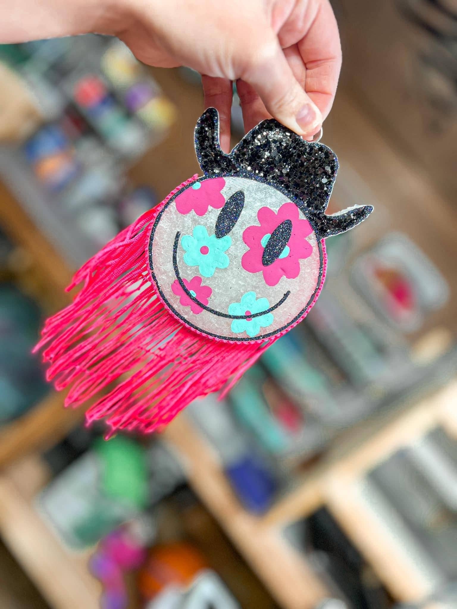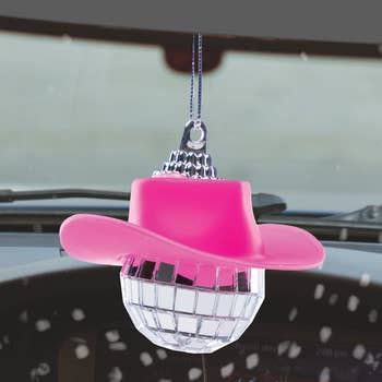 Pink cowboy hat on top of a disco ball that is PERFECT for hanging in the car and on the tree at Christmas! Hard-top cowboy hat on mirrored disco ball with soft natural colored cotton twine long enough to tie + cut as needed. Available in 5 colors; Pink Cow Print, White, Black Cow Print, Pink and Brown We recommend this to display up to 100+ at a time: https://www.amazon.com/Polmart-Countertop-Adjustable-Spinner-Display/dp/B07X59Y5RY?pd_rd_w=rxJb9&content-id=amzn1.sym.c15e5526-d433-4ac0-a393-a3f3f7218fab&pf_rd_p=c15e5526-d433-4ac0-a393-a3f3f7218fab&pf_rd_r=CNVYXF6RC3BX2V20CYBH&pd_rd_wg=tAou2&pd_rd_r=35cb953f-29cb-4dc2-b316-3aa2cea2c00b&pd_rd_i=B07X59Y5RY&psc=1&ref_=pd_bap_d_grid_rp_0_38_t