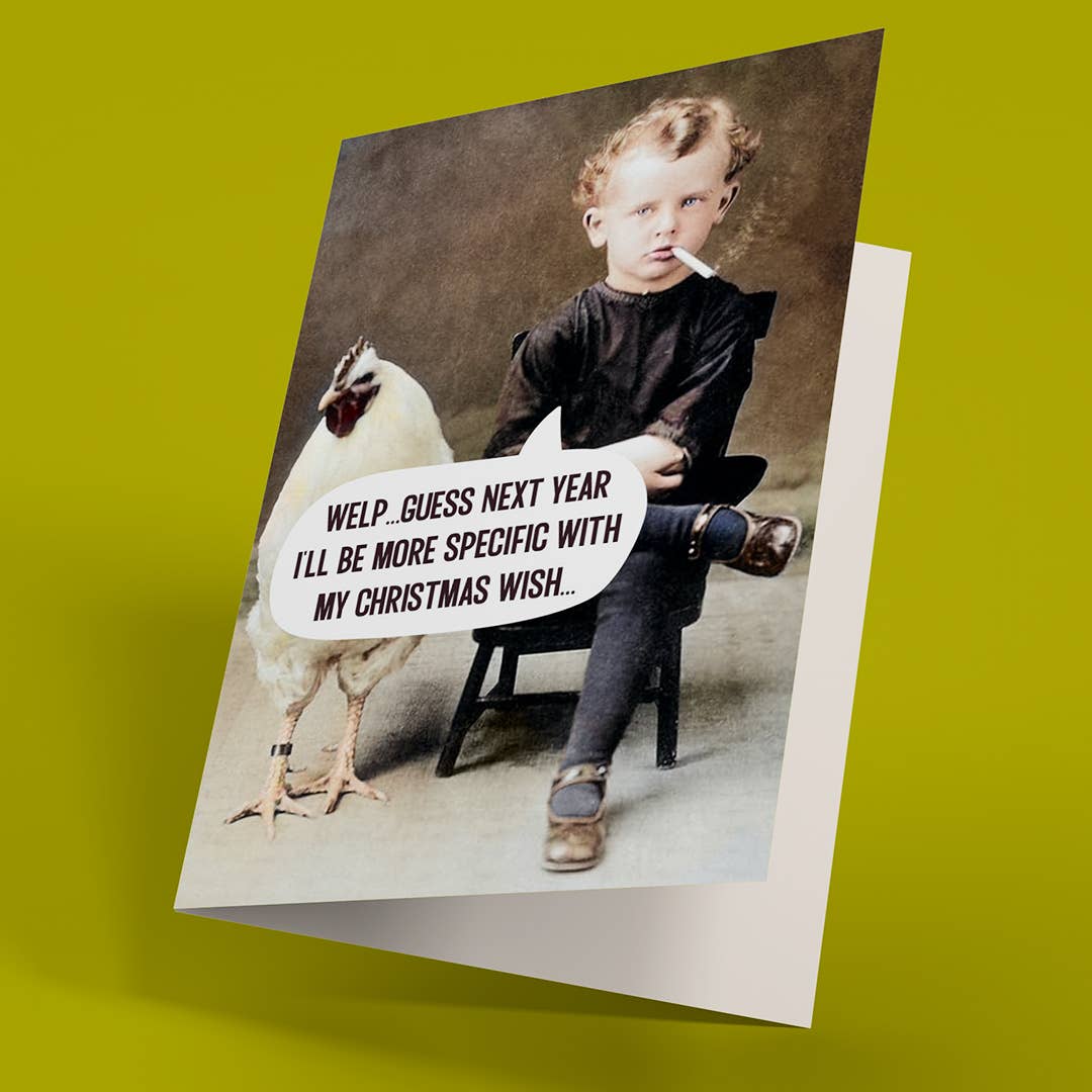 Merry Christmas Lil' Chickie; Cute Original Holiday Card PRODUCT DETAILS: This card is approximately 3.5" x 5.5", which is the original dimensions of the vintage image it was created from. It's digitally printed on 100% recycled, 100 lb. luxurious cover stock. This card is blank inside, and it comes with a 100% recycled, custom sized kraft envelope and wrapped in a custom sized clear plastic sleeve.