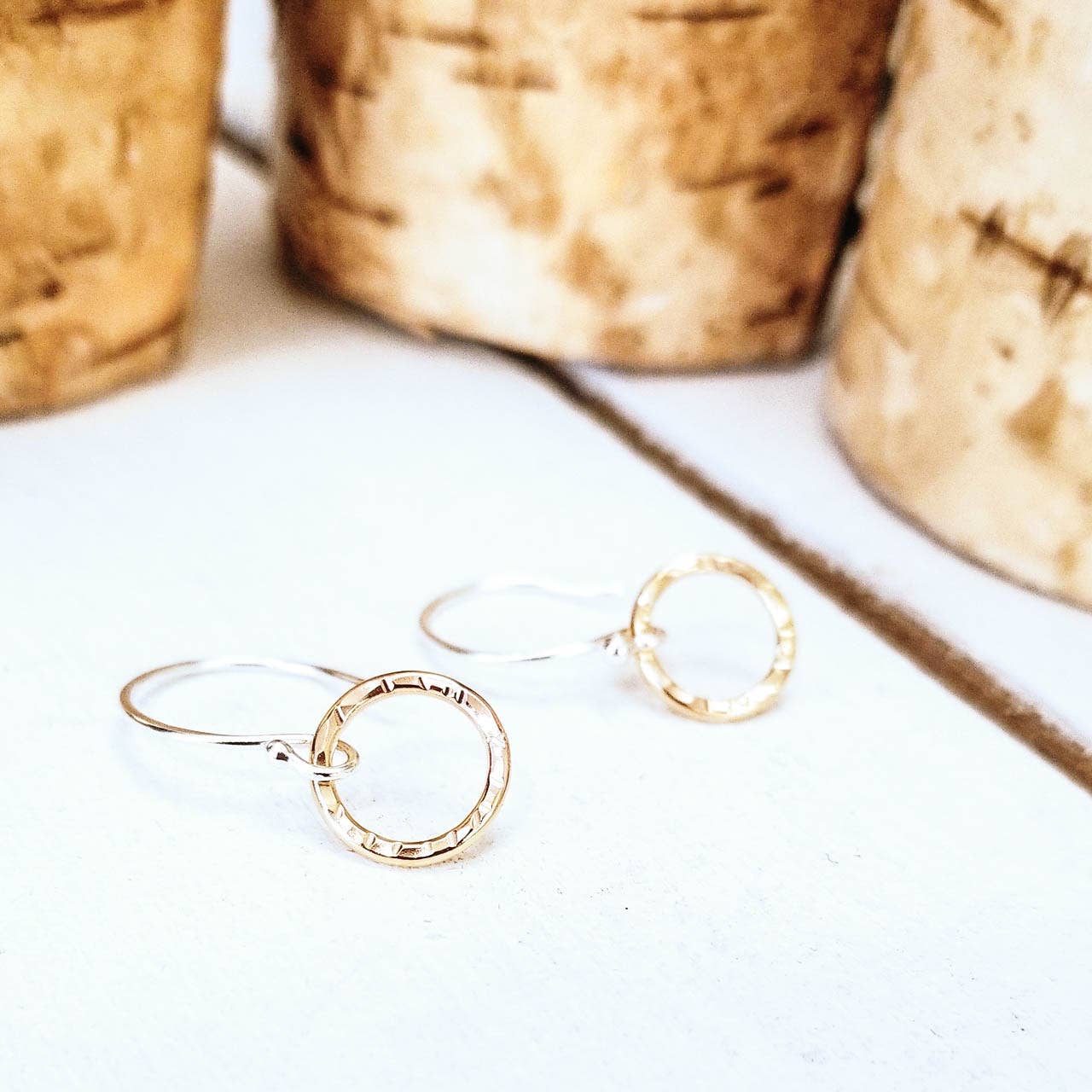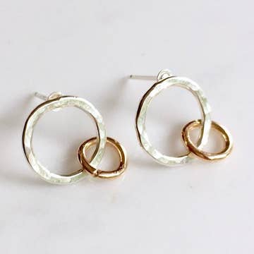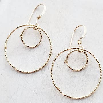 The simplest of little hoops for your everyday wear! Two little hand hammered hoops quietly sit and give you a perfect accent for running errands or writing your next big deal. These easy to wear petite drops keep you good company through whatever your day brings. Standing about 1 3/8" high total, these sterling silver or 14k yellow gold fill hoops are sure to be a long-time favorite.