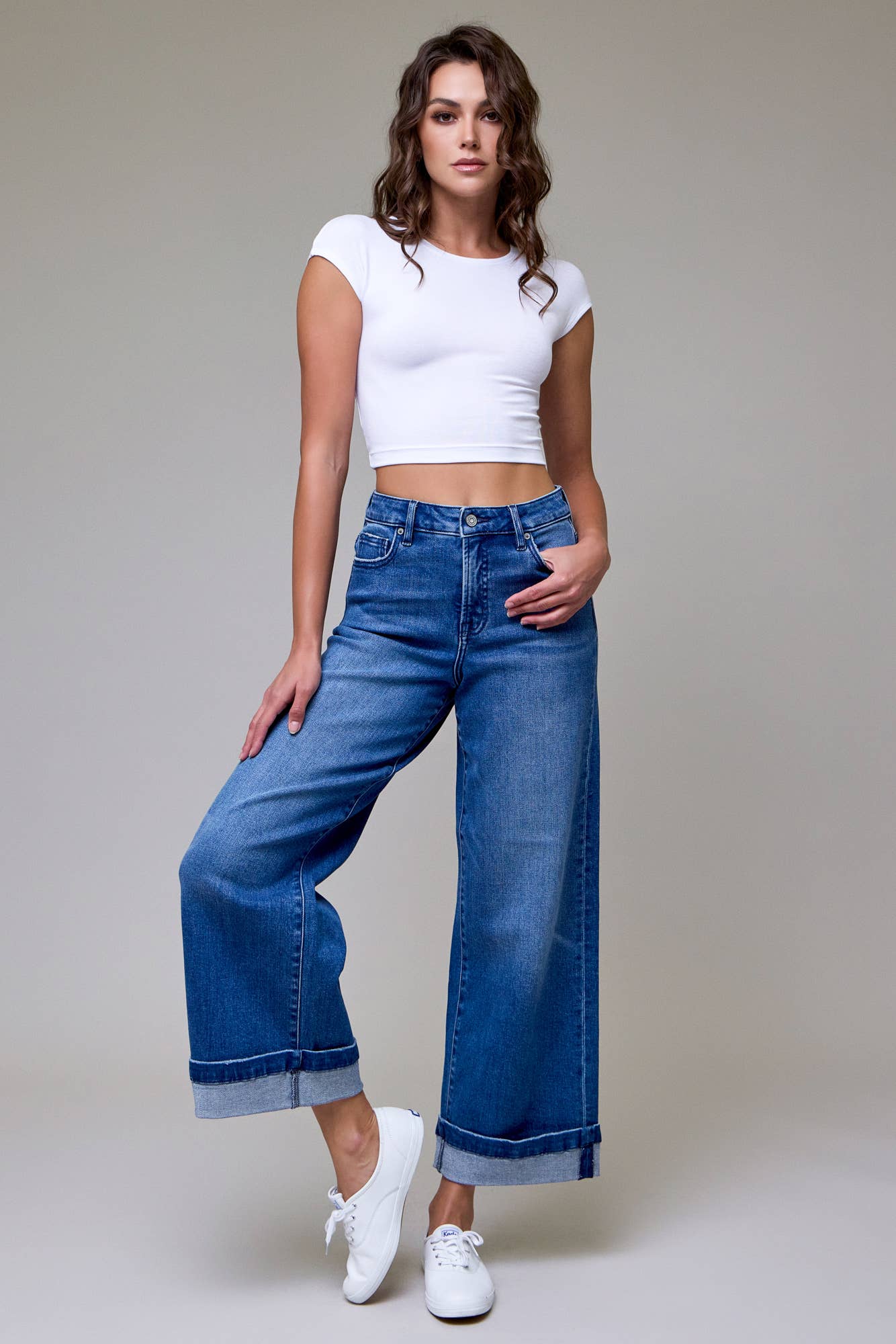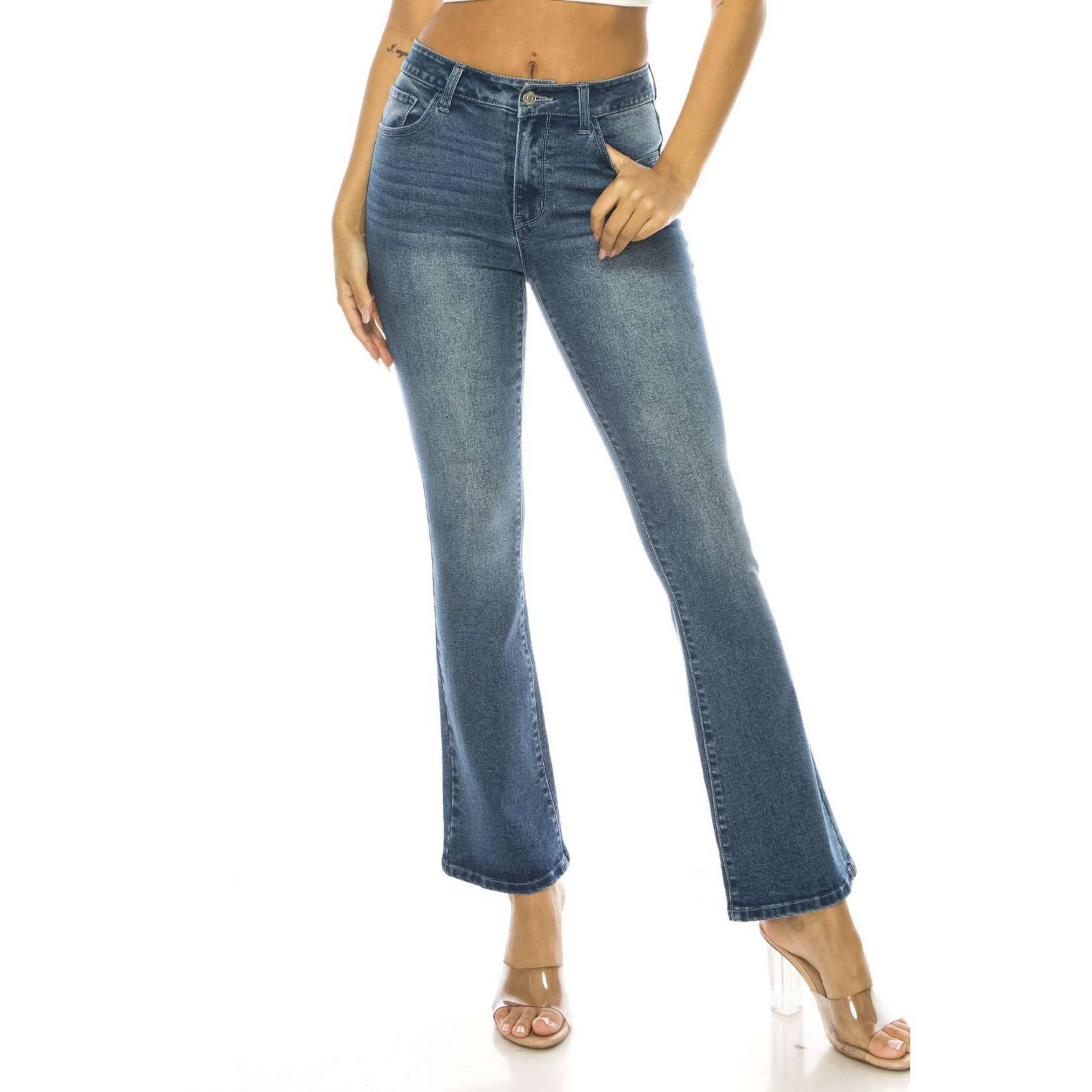 our high rise wide leg denim pant jeans, designed for both style and comfort. The medium indigo wash offers a timeless appeal, while the regular relaxed fit ensures ease of movement. Featuring pork chop pockets and a no yoke detail, these jeans combine practicality with a modern silhouette, making them a versatile addition to any outfit.