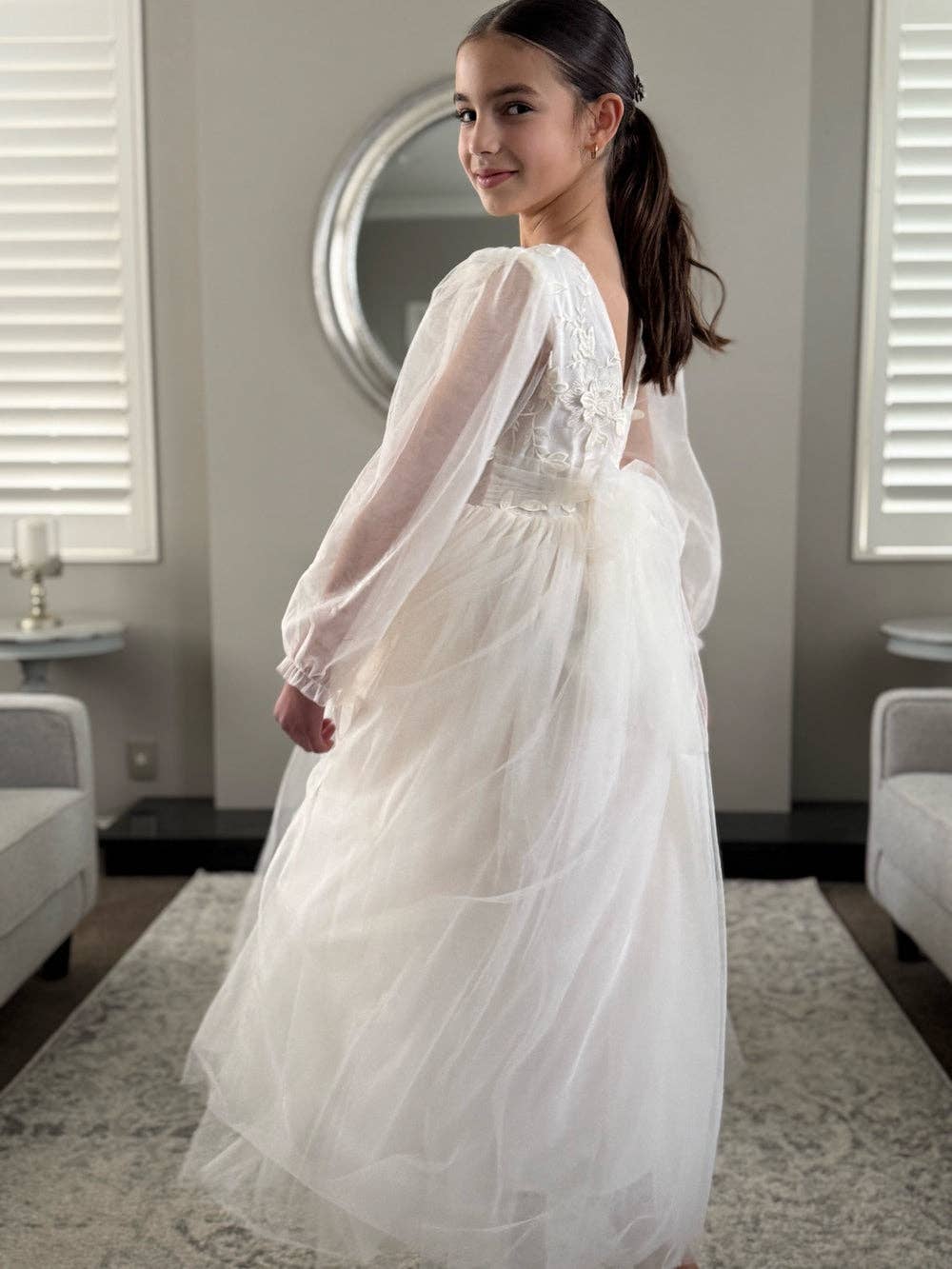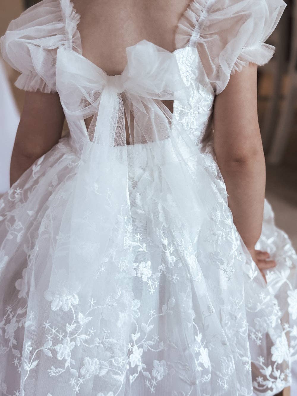 Introducing the Lucy Puff Sleeve Champagne Midi Dress – the most delightful soft colour for your girl's special occasions with a neutral theme. The Lucy dress will be a stunning flower girl dress for your little girl's walk down the aisle or make the perfect party dress. Crafted from a soft cotton blend fabric with a very subtle shimmer, this dress ensures a luxurious feel and an elegant aesthetic. The charming puff sleeves add a touch of whimsy and timeless appeal, giving the most beautiful sweet princess vibe. This Lucy Dress is a versatile wardrobe staple your girls will treasure for all those special milestones. Match with the Lucy champagne baby romper for sweet sister moments Pair with matching Champagne Elegance Sailor Bow or a gorgeous flower crown like the one Annabella is wearing - our Flora Flower Crown Product Details * Below knee length * Puffed sleeves * Zip up back with tie-up bow * 100% cotton lining Sizing Note A little generous but check the size chart or message us with your measurements for a recommendation. Sienna is a slim 10 year old wearing a size 10.
