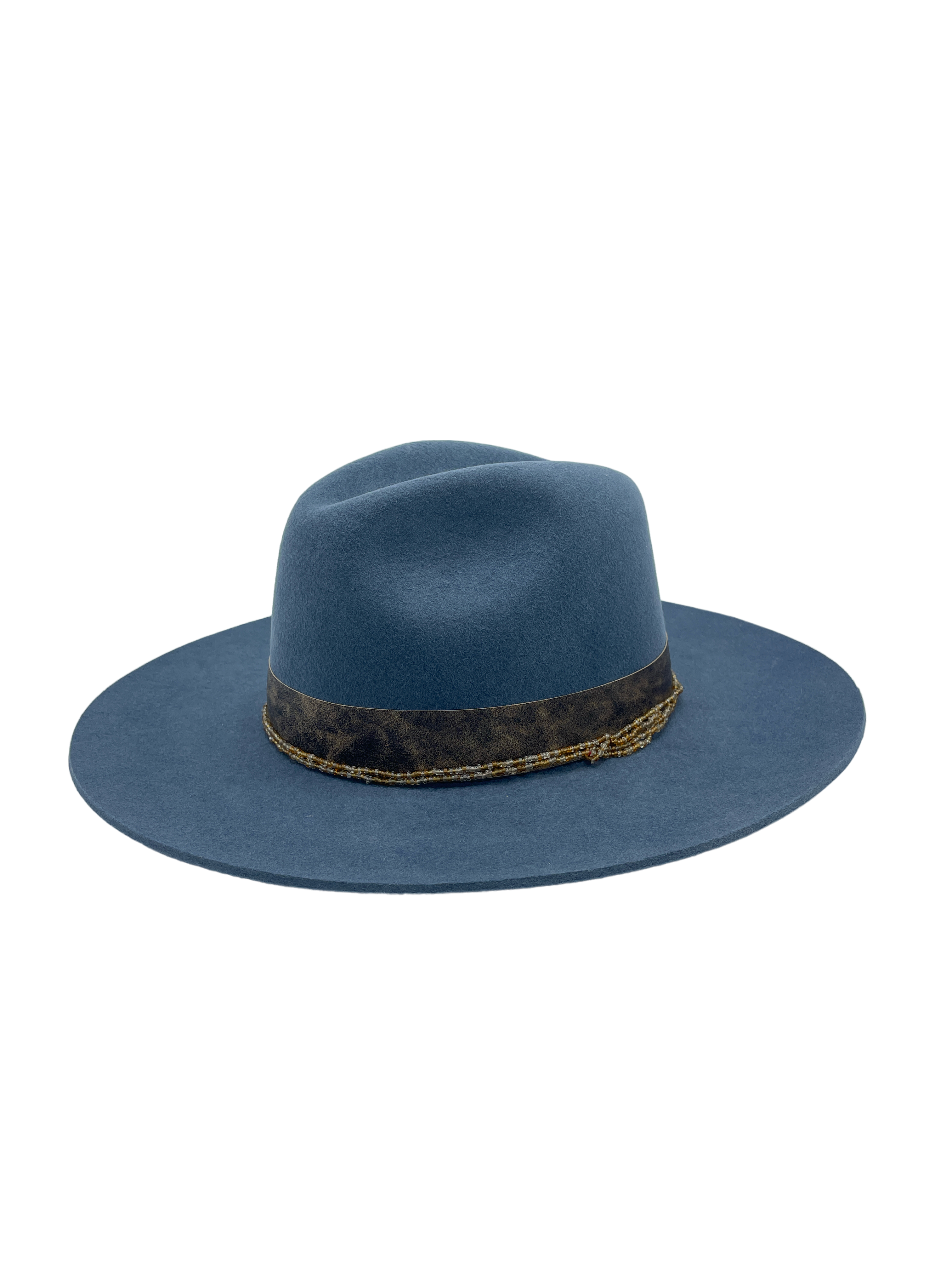 “What you see depends on how you turn the glass” -- Navy Fedora-- 200 Gram Argentine Wool Felt Quartz Crystals Rainbow Sari Silk Llama Leather Sweatband Brim Width: 3.5" (can be made to any width upon request up to ~4") Crown Height: 5"