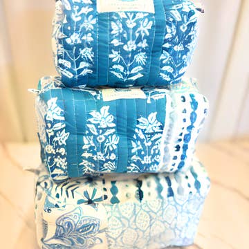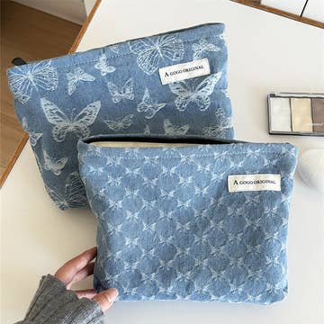 Embroidered blue bow makeup bag Blue zipper detailing Dimensions: 7" x 4" x 4"