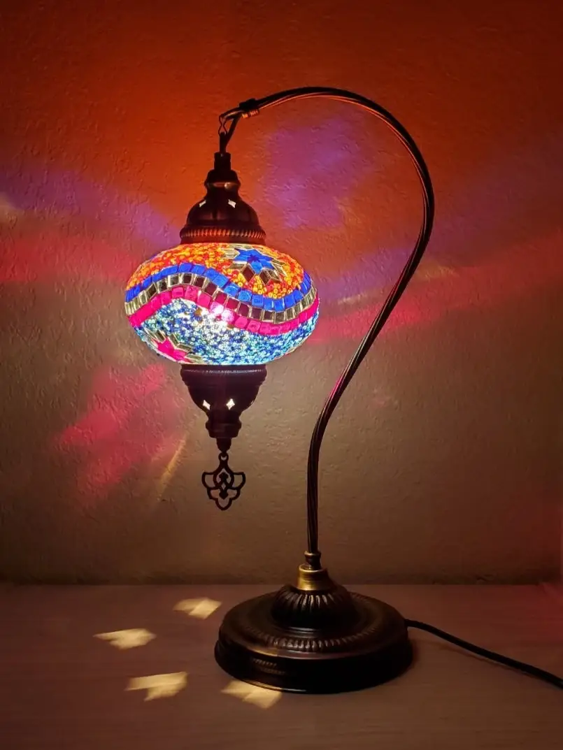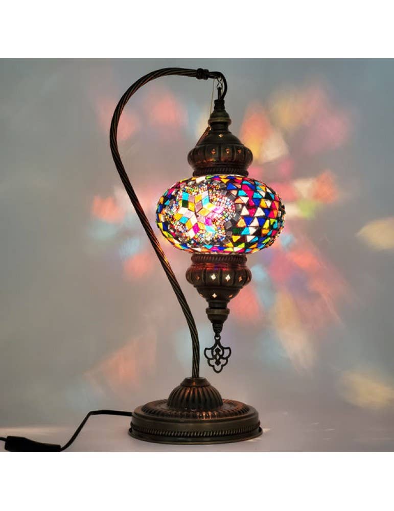 Ignite your inventory with our breathtaking 3-in-1 Handmade Turkish Arc Lamp with Star pattern mosaic art. This exquisite lamp, crafted by skilled artisans, features three stunning mosaic globes that capture the dynamic energy and warm hues. Perfect for creating a cozy and inviting ambiance, this lamp is ideal for customers who appreciate unique, artisanal décor and stunning gift pieces. Stock up now and offer your customers a captivating piece of functional art that brings both beauty and warmth to any room. Mosaic glass part of the lamps are inspired by different cultures of Anatolia, Turkey. All mosaic glasses are made by housewives in their own homes to support their family, while taking care of their children. You help underprivileged families when you buy our lamps. All the parts of this lamps are 100% handmade in Turkey. Size: Glass 5" Height 20".