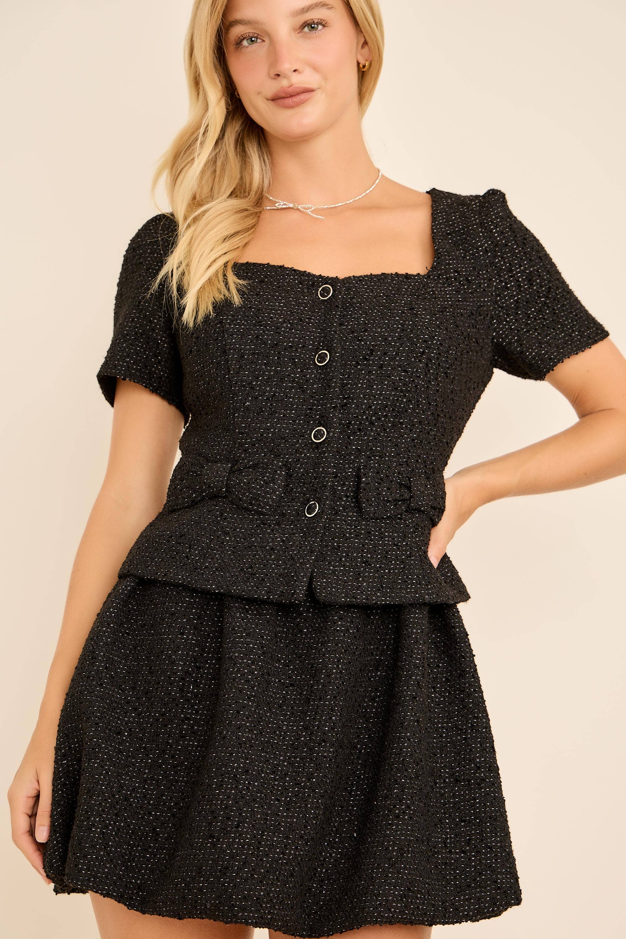 A tweed mini dress featuring round neckline, short sleeve, front button detail, A line skirt and back zipper closure Details: Self : 100% Polyester Lining : 100% Polyester Size & Fit - Model is 5`8" And Wearing Size Small - Measurements Taken From Size Small - Approx. Length: 39"