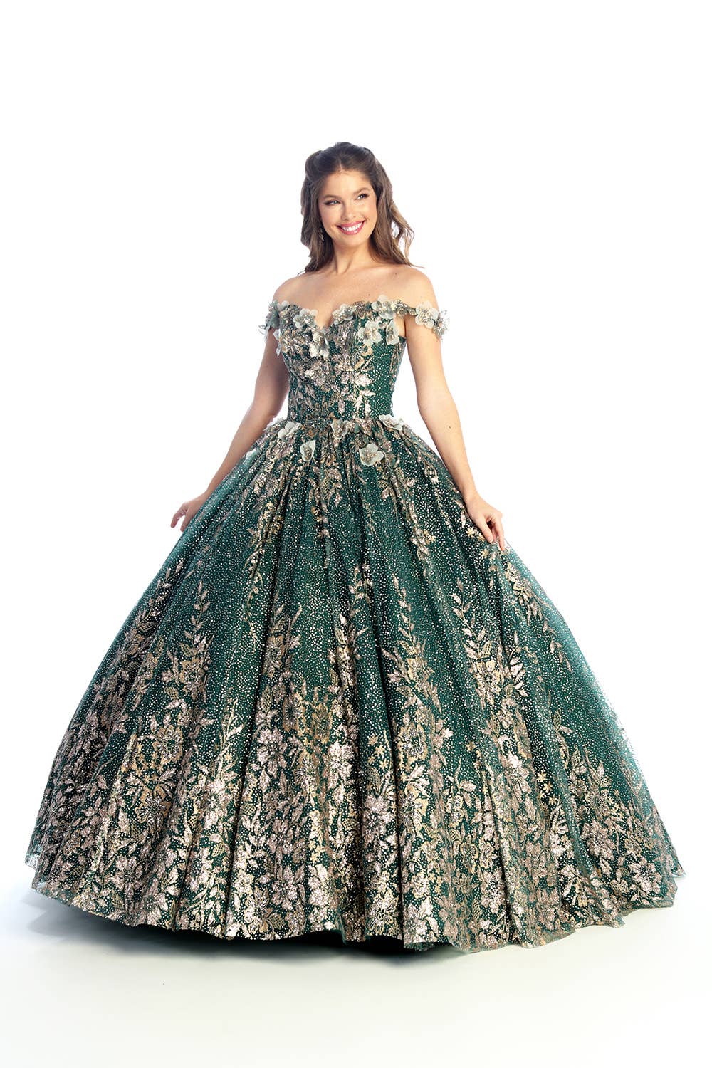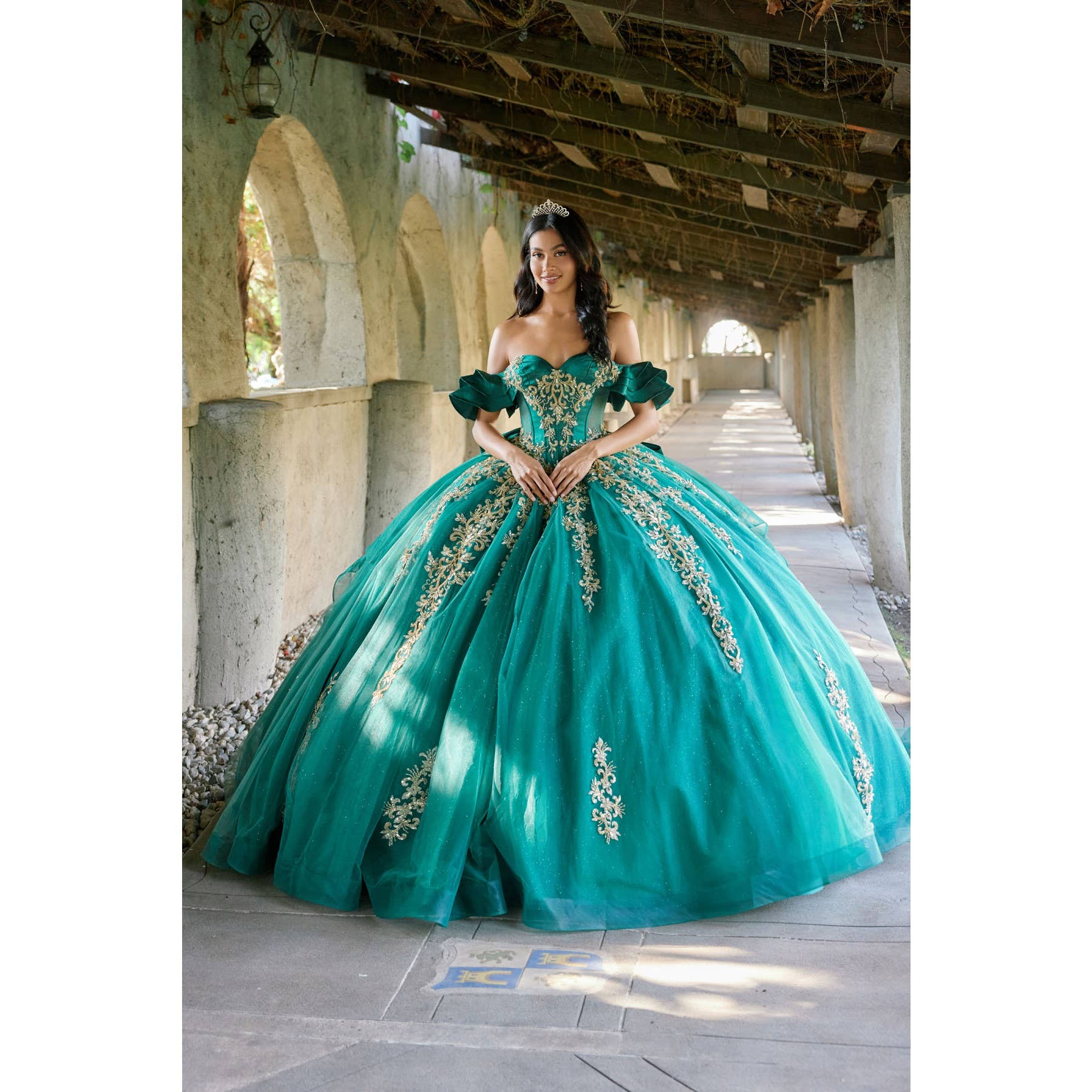Multilayered off the shoulder quince dress with bow on back. Royal colored dress is pictured with our most popular petticoat PC325-5.