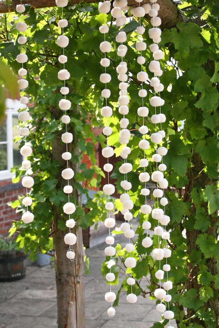 Red pom pom garland with traditionally made yarn pom poms on a waxed cotton string with hanging loops at each end. Each garland comes in a pretty cotton mesh bag, drawstring ties with pink pom poms at the ends of the ties. Pefect for christmas and festive decor
