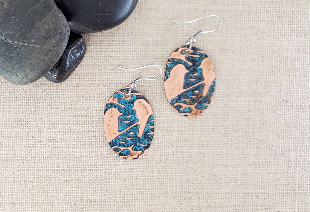 These earrings are cut, embossed, and antiqued to create a unique kayak design. Perfect for those who prefer medium-sized earrings, they offer a distinctive and stylish look. All of our earrings are made using high quality, lead and nickel free, hypoallergenic surgical stainless steel hooks.