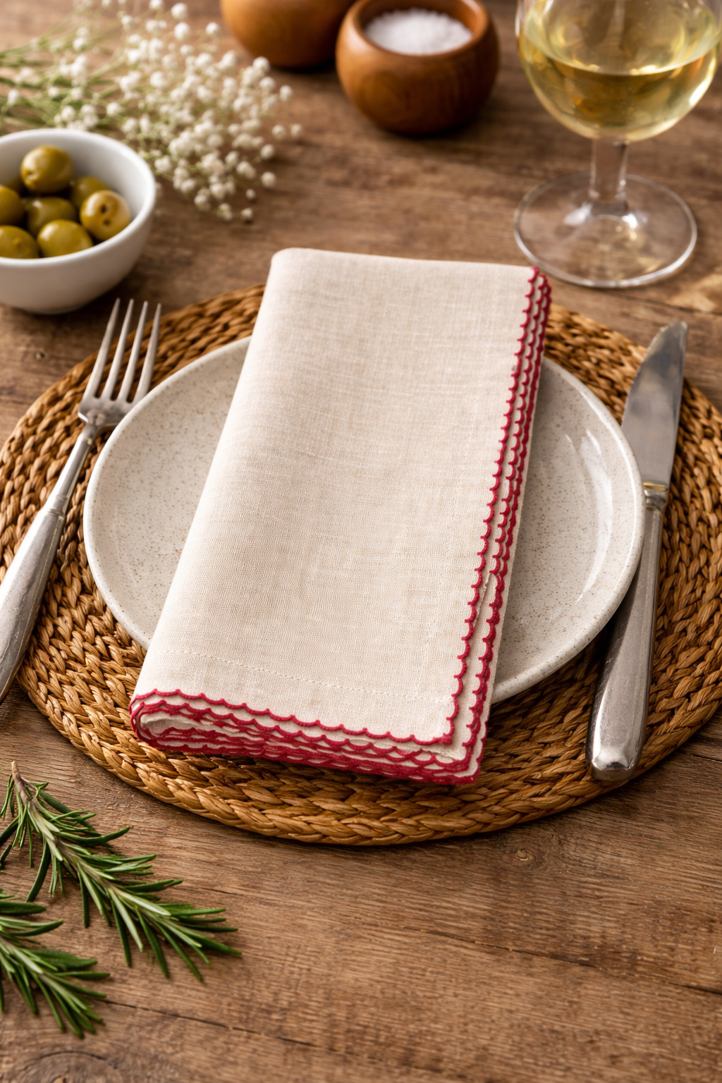 A pretty cloth napkin with simple and short fringe trim. Search Keywords: MEM23, patriotic
