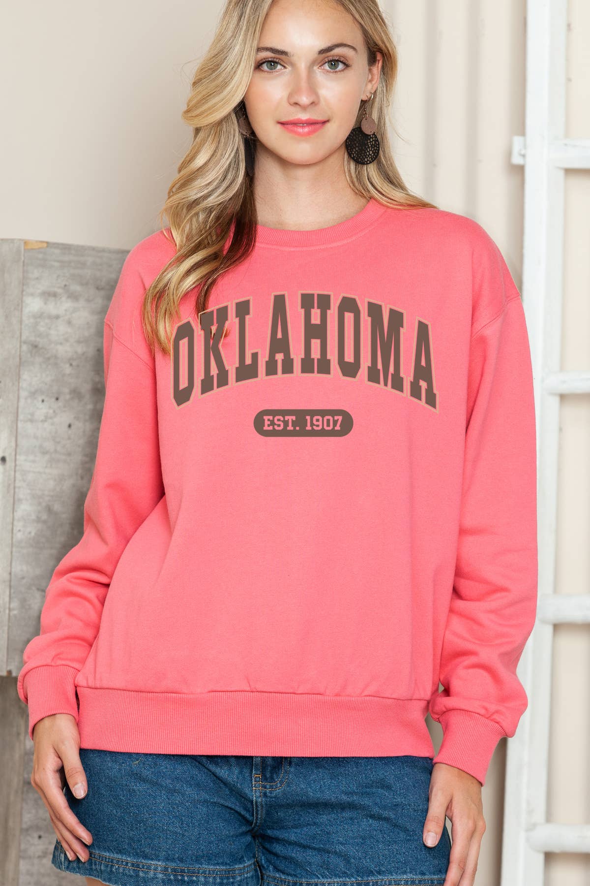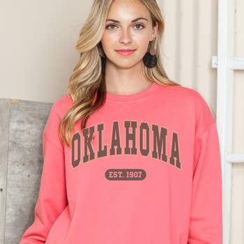 Oklahoma Est. Bows Pink Corded Crew Sweatshirt