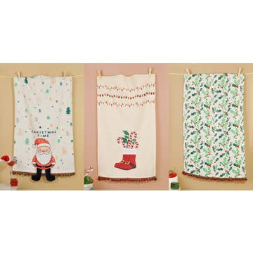 This handmade linen/cotton kitchen tea towel features our exclusive "Gingerbread Village" holiday print design. Designed with a variety of gingerbread houses, this fun winter dish towel is an effortless way to spread Christmas cheer to any kitchen! Our durable and cute tea towels also make great hostess gifts and housewarming presents - not to mention wonderful Christmas and holiday gifts! Digitally printed with Eco-friendly, non-toxic dyes & joyfully made In The USA. Features high quality construction details such as mitered corners and 1 corner hanging loop. Color - Shades of Brown, Green, Red, and white. Fabric - 55% Linen/45% Cotton Size - Approximately 17" x 26"