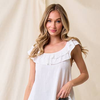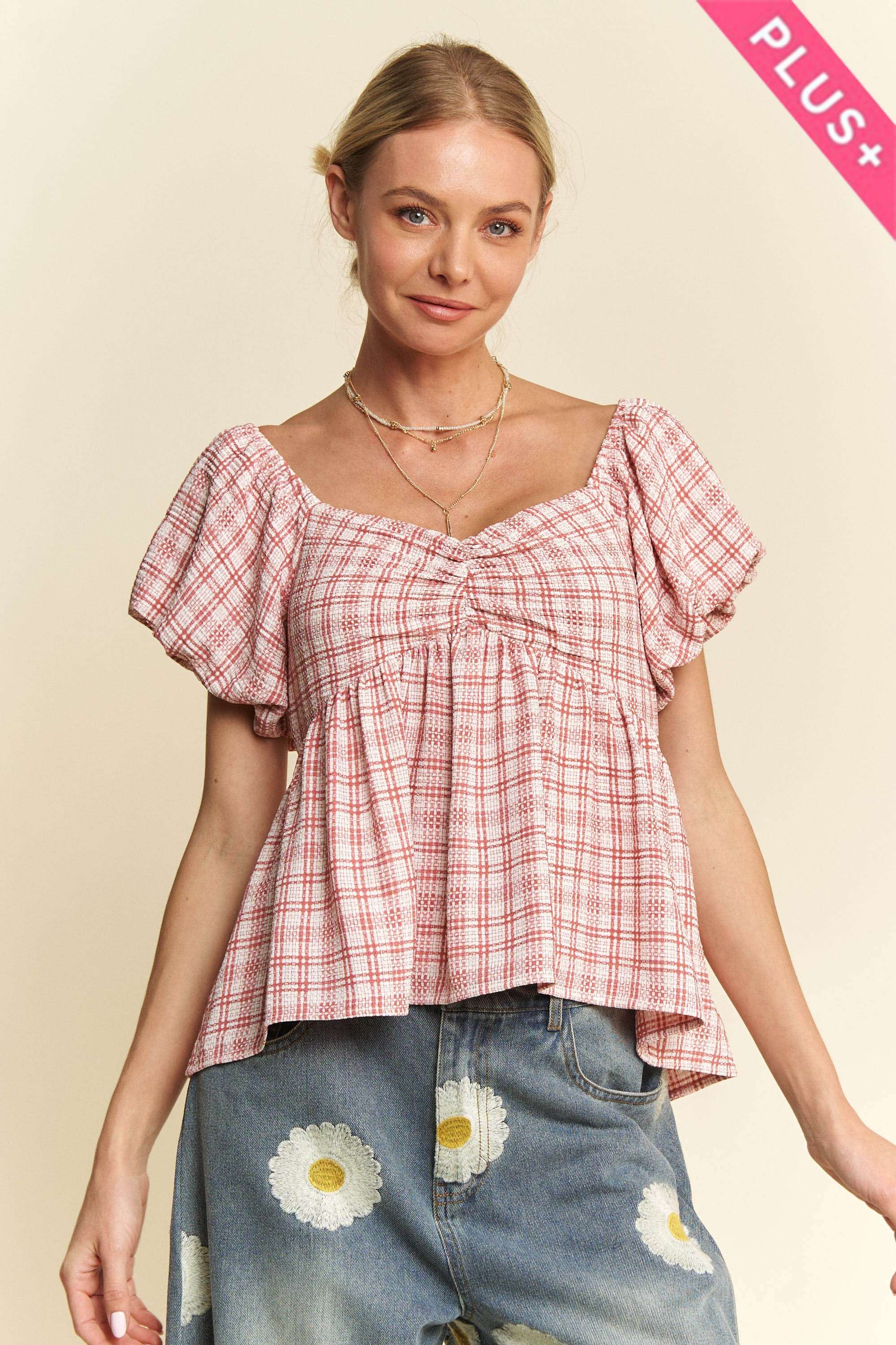 A GINGHAM PRINT TOP FEATURING A V NECKLINE, A DOUBLE RUFFLE ON ARMHOLE, CURVED HEM,AND A RELAXED FIT. *MODEL IS WEARING SIZE SMALL