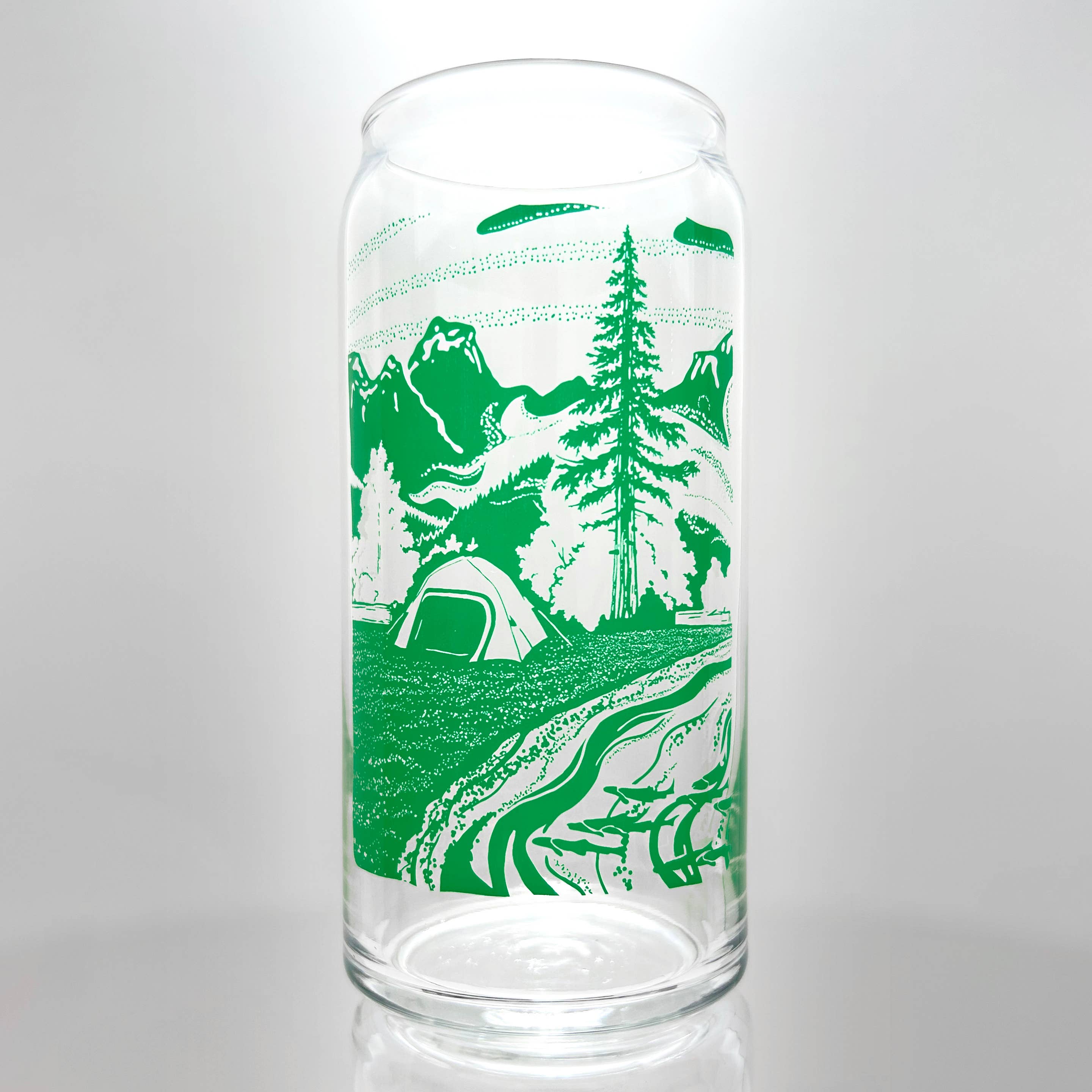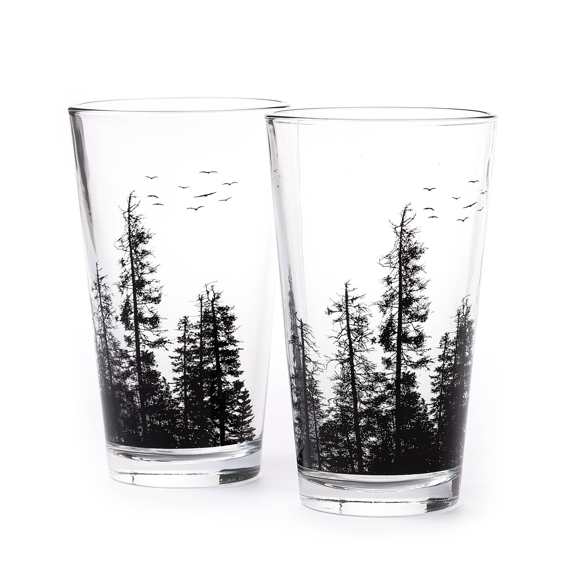 This product listing is for a 4-piece set of quality beer glasses, each decorated with a detailed nature theme that stands alone, but also aligns with the others to create a complete panoramic vista! Our 'Brew View' foreground subjects include a campfire, tent, bear, salmon, whale, and otter, all situated in a majestic mountain/forest/coast landscape. Features: • Dishwasher safe and durable • Decorated via vibrant, colorfast screen-printing • 20 oz capacity (full Imperial pint) • 6.375” tall, with a 2.875" diameter • Manufactured in the USA; decorated in Canada • Featuring original art by Bough & Antler *We offer a printed packaging option to accompany your purchase of this Brew View set: Our cardboard carriers are a stylish and functional add-on that makes this product all the more giftable! Please note these carriers are shipped flat and will require simple folding assembly (see our video in this listing for help!).