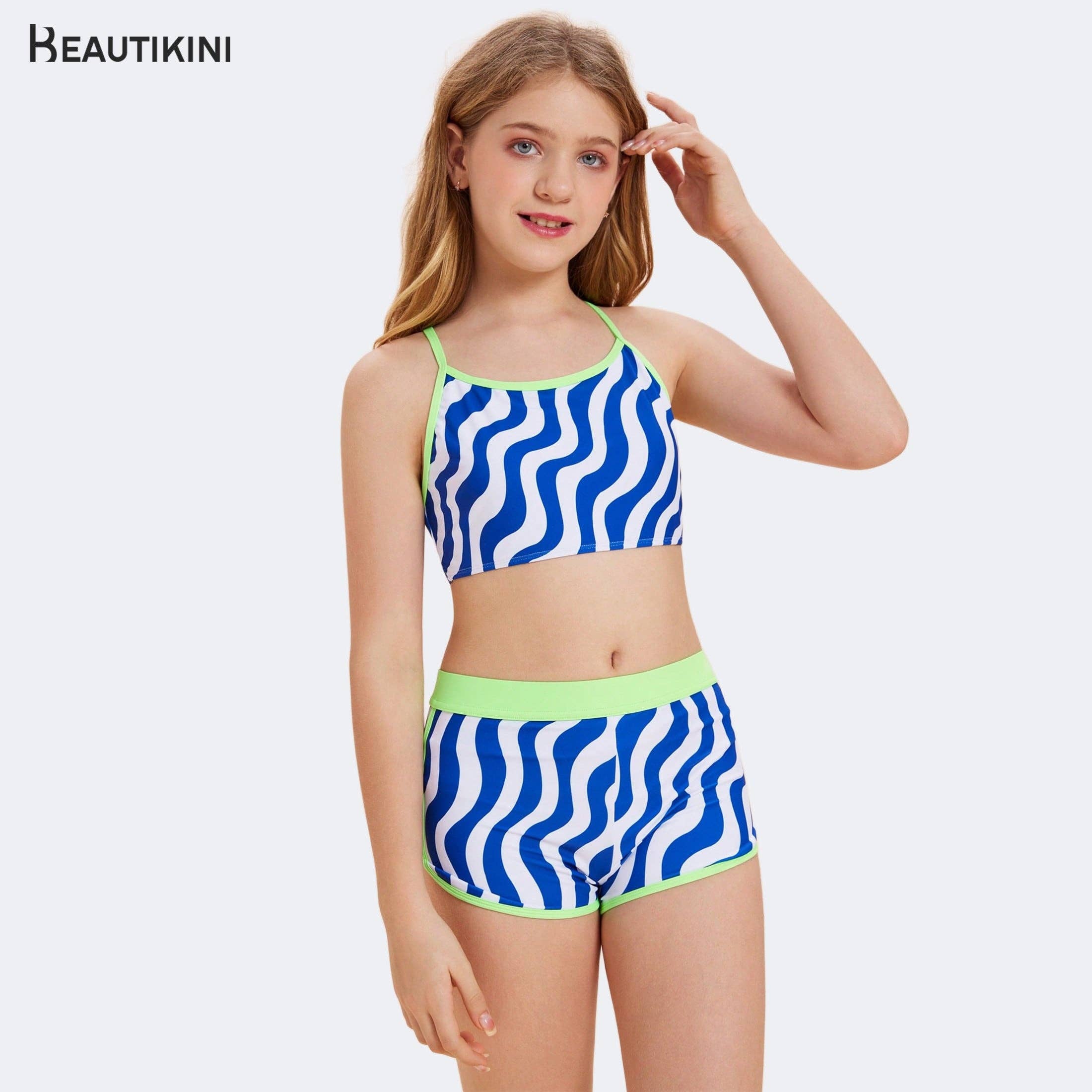 A hip Multi Colored Red-Black-Blue-green-Yellow-Teal Striped Halter Top 2-PIECE Girls Bathing Suit Set with Full Classic Side-Tie Bottoms. A Great age-appropriate fit which provides great coverage without compromising movement and comfort. Made with Soft High Quality Swimsuit Fabric by American Brand Chance Loves. * High Quality Soft Swim Fabric and Lining * NO paddingHigh Quality Swimwear for Tweens and Teens Girls ages 7-16 and Bikinis
