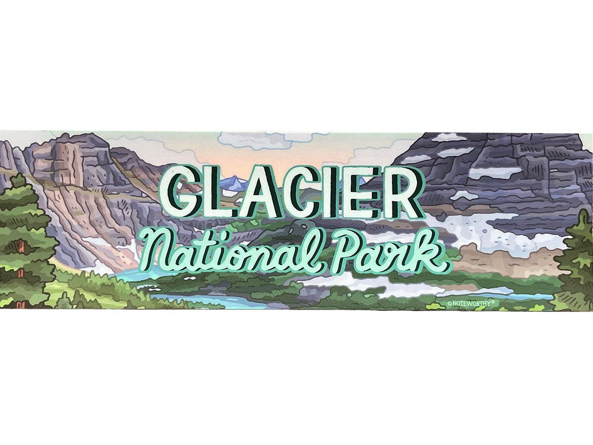 Size 4-1/2" x 6" Offset and foil printed on uncoated cardstock Image Description: a rectangular digitally printed post card of a Glacier National Park mountain scene, the gold text "GREETINGS FROM GLACIER NATIONAL PARK" across the front of the scene All images, products and designs © Noteworthy Paper & Press