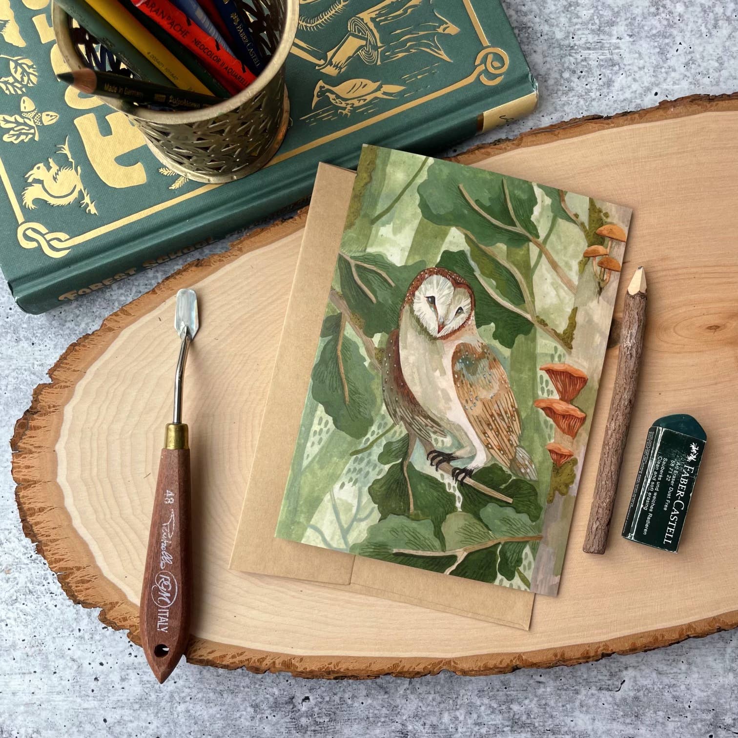 Spotted Owl Forest • Mineral Letterpress Card Spotted Owl + Big Cone Douglas Fir SIZE: 5.75"h x 5.75"w inches (card folded) 6"h x 6"w inches (envelope) MINERAL PIGMENT: Blue Ridge Raw Umber (Brown) + Dark Ochre (Brown) PAPER: Kraft 100# French card stock (hydoelectric + recycled) PRINTING PRESS: Vandercook No. 4 Proving Press (circa 1936) Each letterpress print is a unique expression of paper, pigment, and printing press Hand ground mineral pigment Hand mulled flax oil organic printmaking ink Hand cut paper Hand printed one at a time Hand folded one at a time Hand tied packaging one at a time Hand made with love