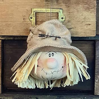 The Primitive Scarecrow Sack Hanger is a decorative plush scarecrow head figurine ornament. The scarecrow is made of rustic tan burlap fabric and features a stitched patchwork face and a bundle of raffia straw. The top of the ornament includes a string hanger, making it perfect for hanging from a hook, knob, tree, or other space in the home during the Fall season, offering a charming vintage touch. Measures 9” high by 3.5” wide by 1.5” deep.