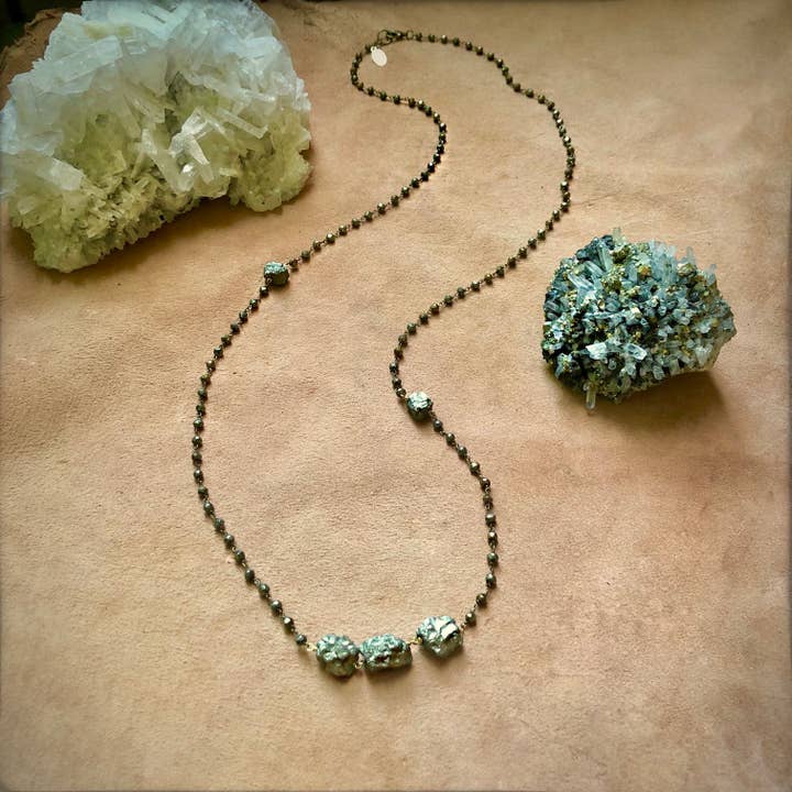 This showstopper necklace is made from braided black deerskin leather and a gold-painted druzy quartz. An original blend of boho, hippie, rocker, and pagan aesthetics with a nod to Jack Sparrow, this necklace is sure to be a conversation piece. The large gold and white stone is a partially-painted druzy quartz, and each is unique. The tassel is accented with a couple African brass beads. Necklace length to the pendant is about 32." Stone and tassel are about 7" combined.
