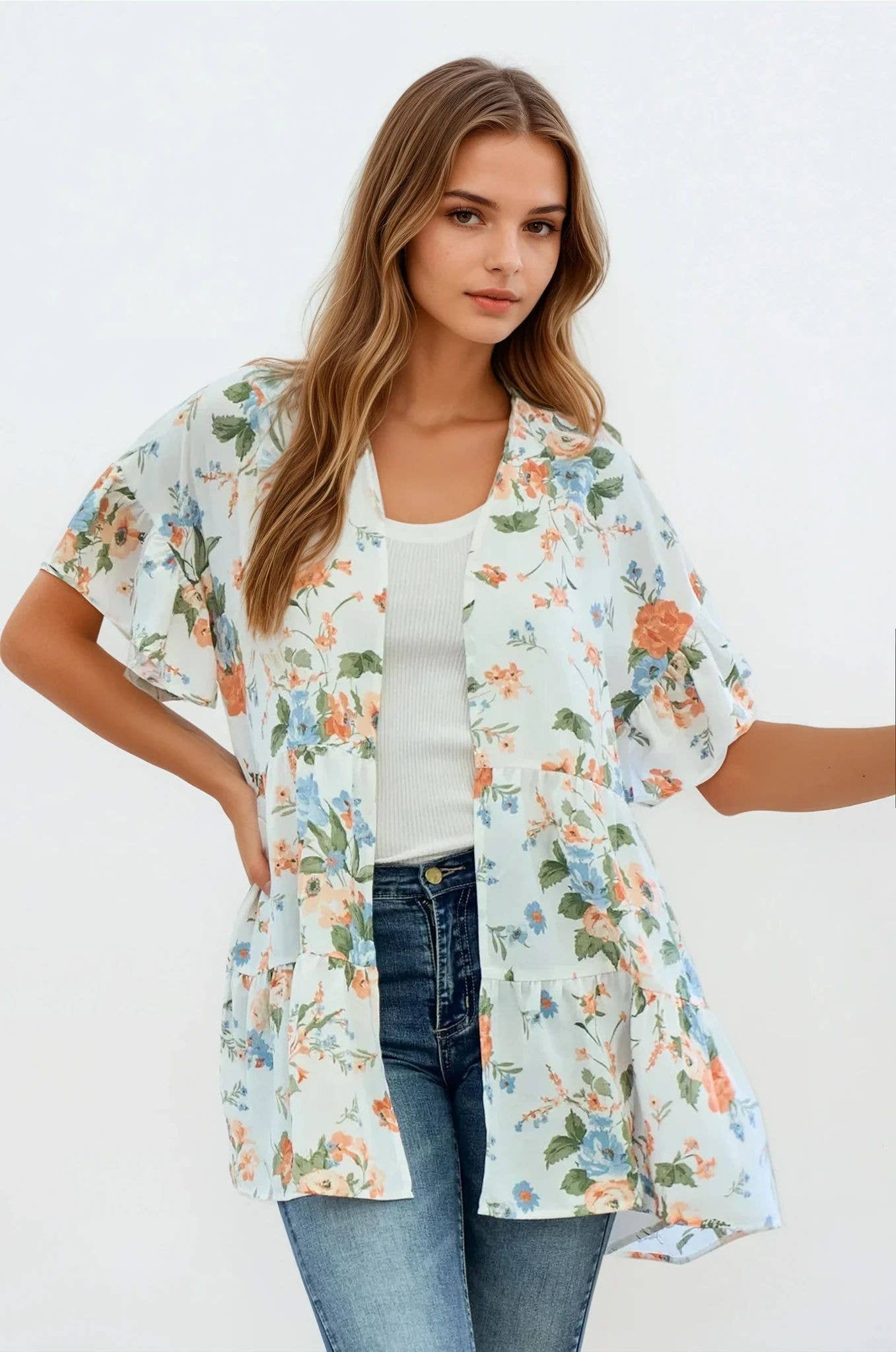 Colors : Sage , Pink Experience a blend of lightness and grace with the Floral Printed Ruffle Sleeve Chiffon Kimono Cover Up. Color and Pattern: Decorated with a serene floral print in soft sage tones, this kimono captures the essence of spring and summer. The delicate floral pattern is distributed throughout, offering a fresh and uplifting vibe. Material: This kimono is crafted from 100% polyester, making it exceptionally light and breathable. The chiffon fabric provides a translucent, airy feel that is ideal for warm weather, ensuring you stay cool while looking stylish. Design: Featuring charming ruffle sleeves that add a playful yet sophisticated touch, this kimono exudes femininity. The open-front design enhances its flowing silhouette, making it easy to wear and layer over different outfits. Details: It’s designed to fit up to a size 1XL, offering a versatile and forgiving fit for various body types.
