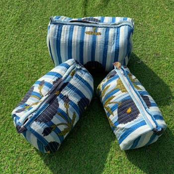 These toiletry bags are a perfect trio for your travel routine and organization. Featuring a hand-printed block print set against quilted stitching, these adorable bags are eye-catching and perfect for any on-the-go lifestyle. Grab one or purchase the whole trio of different sizes and travel in style. These bags are made by a woman-owned store that I order them from. Details: - Features a durable zipper closure to keep your items secure - Fully lined with a waterproof lining to protect against any spills or leaks Measurements: - Large : 10" (Length) x 4.7" (Width) x 5.5" (Height) - Medium: 8.3" (Length) x 3.9" (Width) x 4.3" (Height) - Small : 7.5" (Length) x 3.5" (Width) x 3.9" (Height) If you have any questions, please feel free to ask! I hope you shop with us :) Thank you!