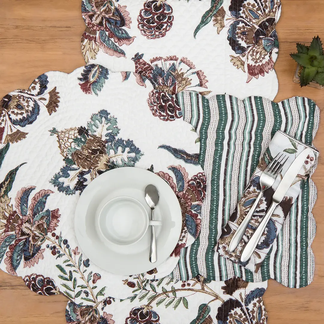 These intricately-detailed placemats have a lovely all-over motif of stylized dogwood blossoms set against a sheer lace background. The structured border is ringed with dogwood blossoms creating a very detailed cut edge. Care & Content 100% polyester. Machine wash cold, gentle. Do not bleach. Lay flat or hang to dry. Touch up with cool iron if desired.