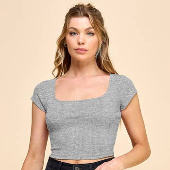 RAYON MODAL ROUND NECK SHORT SLEEVE CROP TOP. MODEL IS 5'6" AND WEARING A SMALL 92% RAYON MODAL 8% SPANDEX