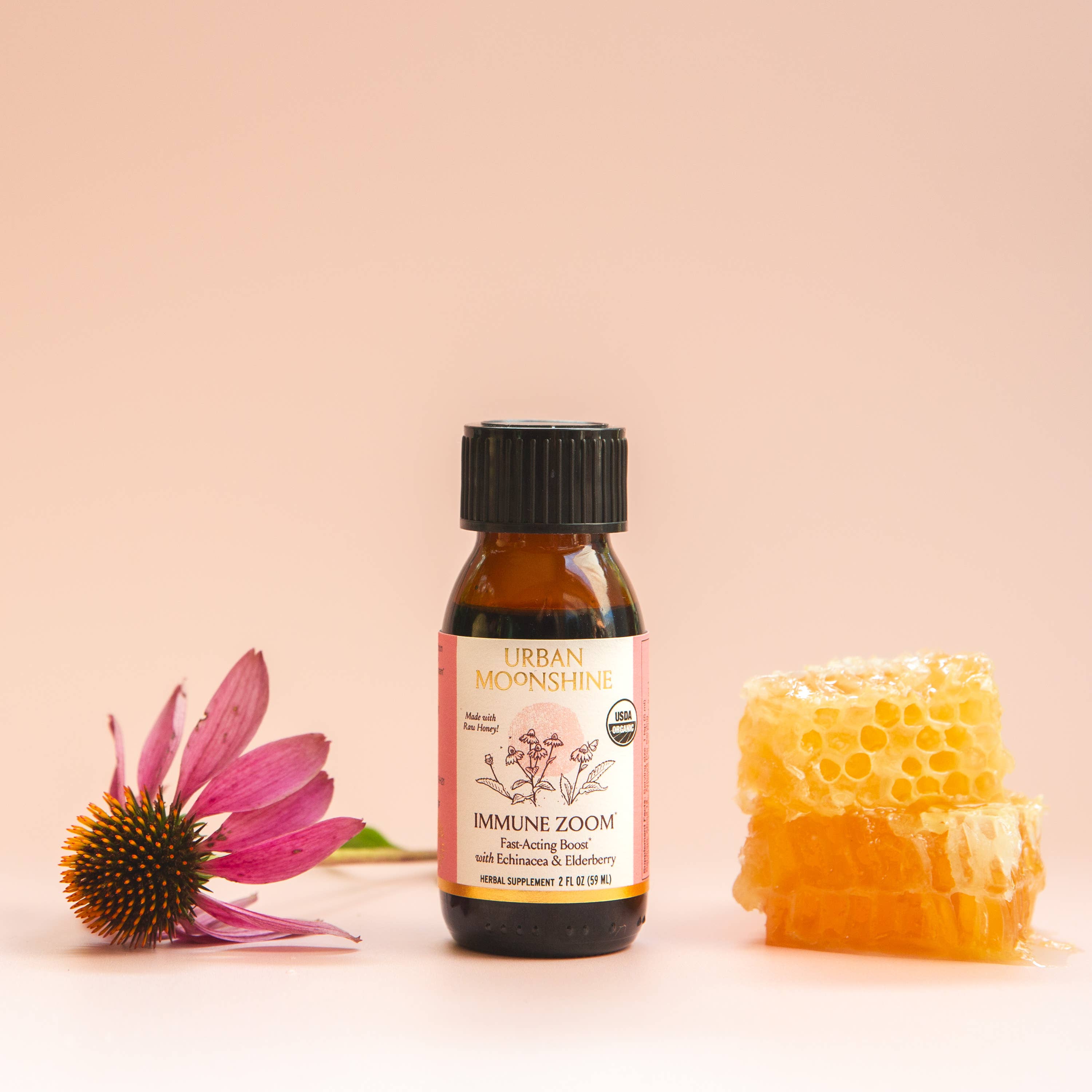 Fast-acting boost with echinacea, elderberry & raw honey. A powerhouse formula and an all-time favorite, Immune Zoom is traditionally used to support the immune system and maintain a healthy immune response. Details: Maintains a healthy immune response. Provides a fast-acting elderberry boost. Stimulates the immune system. Features raw organic honey, plus warming cinnamon, cayenne, and ginger. Ingredients: Organic proprietary herbal extract blend: organic echinacea root; org. Elderberry juice (from concentrate); org. Echinacea tops; org. Elderflower; org. Cinnamon bark; org. Ginger root; org. Chili pepper fruit. Other ingredients: filtered water; org.