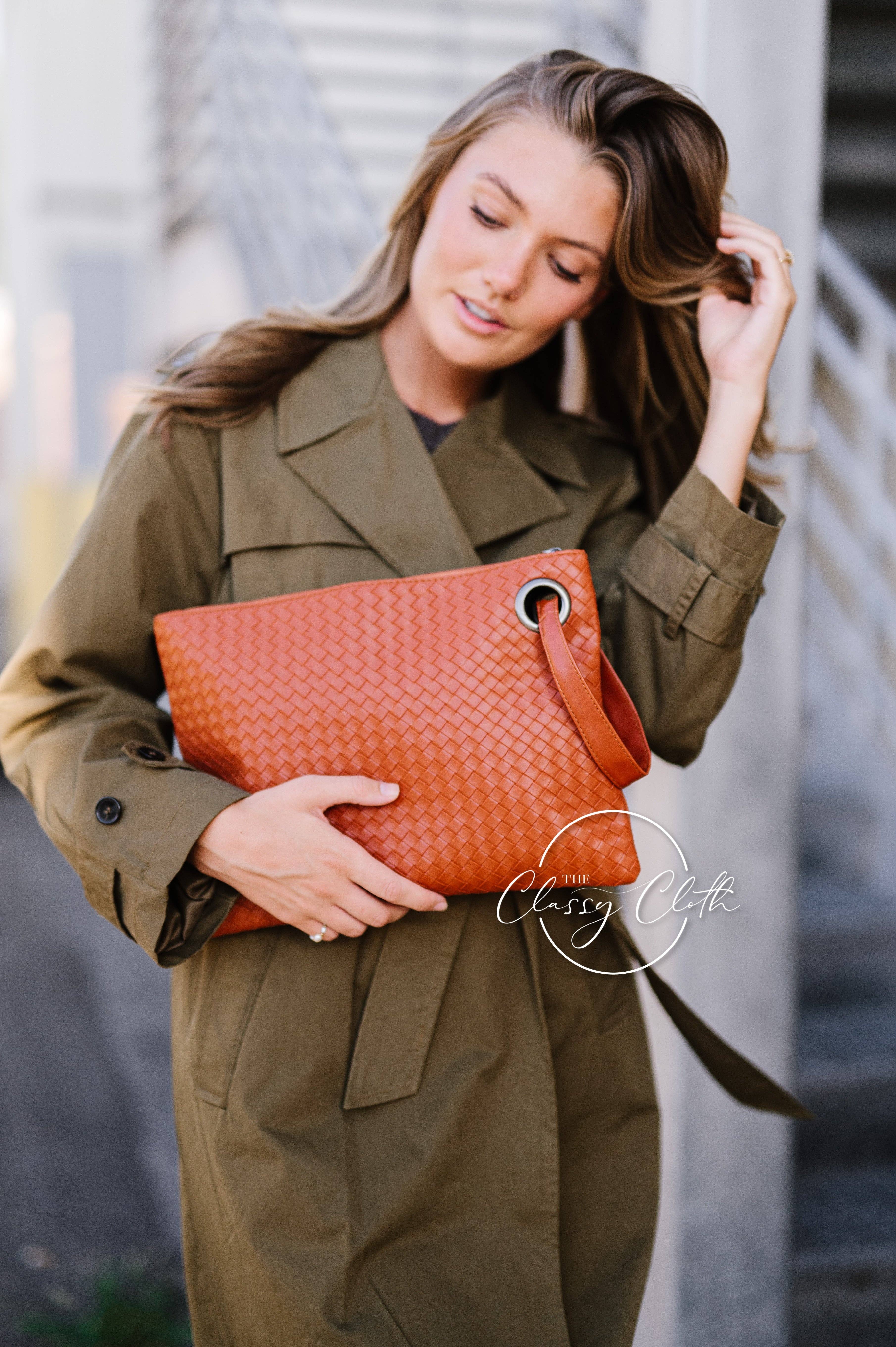 Trendy and stylish, this woven PU leather oversized clutch with a matching wrist strap sure gets the party started! Its grommet detail and top line zipper closure add a touch of sophistication. Plus, you’ll never run out of space with three internal pockets (one of 'em zippered!) and a lined inside. Get ready to rock the weave trend! Introducing the Trendy Clutch in Weave faux leather. This elegant accessory is the perfect statement piece to add to your wardrobe. Its on-trend weave pattern sets itself apart, elevating any outfit casual to dressy. Inside Details: Lined inside Inside zippered pocket on one side 2 Inside open pockets on the other for cell phone or small items Exterior Details: Fabric is Weaved Faux Leather Matching wrist strap 1' Diameter Grommet detail Top Line Zipper Closure