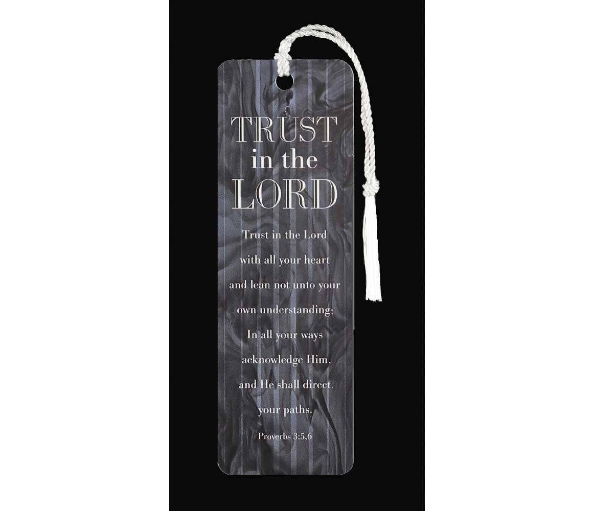 Sharing books with dog-eared pages leaves the reader needing clarification about her own progress. Instead, share a book with pristine pages and include the Trust In The Lord Blue Faux Leather Bookmark as a page marker and a compass for her spiritual growth. Heat-debossed typographical Scripture verse design, Gold foil accents, Cornflower blue faux leather, Heat-debossed and gold-foiled text, Trust in the Lord with all your heart and lean not on your own understanding; in all your ways submit to Him and He will make your paths straight, Proverbs 3:5-6, Blue topstitching, Blue satin ribbon tassel, Individually packaged in PVC pouch, Hanging tag, Size: 6.5” x 2.2” x 0.1” (165 x 56 x 3mm)
