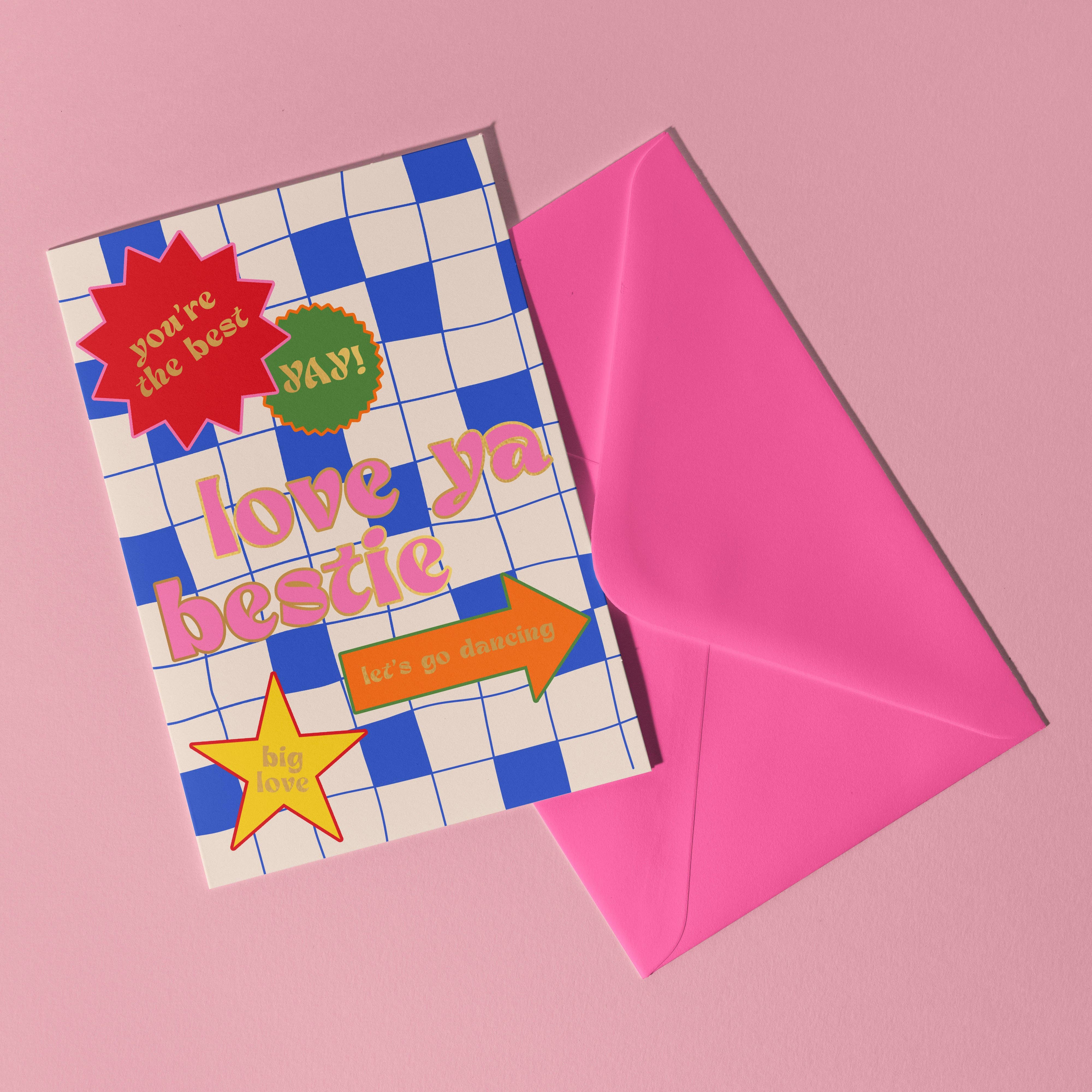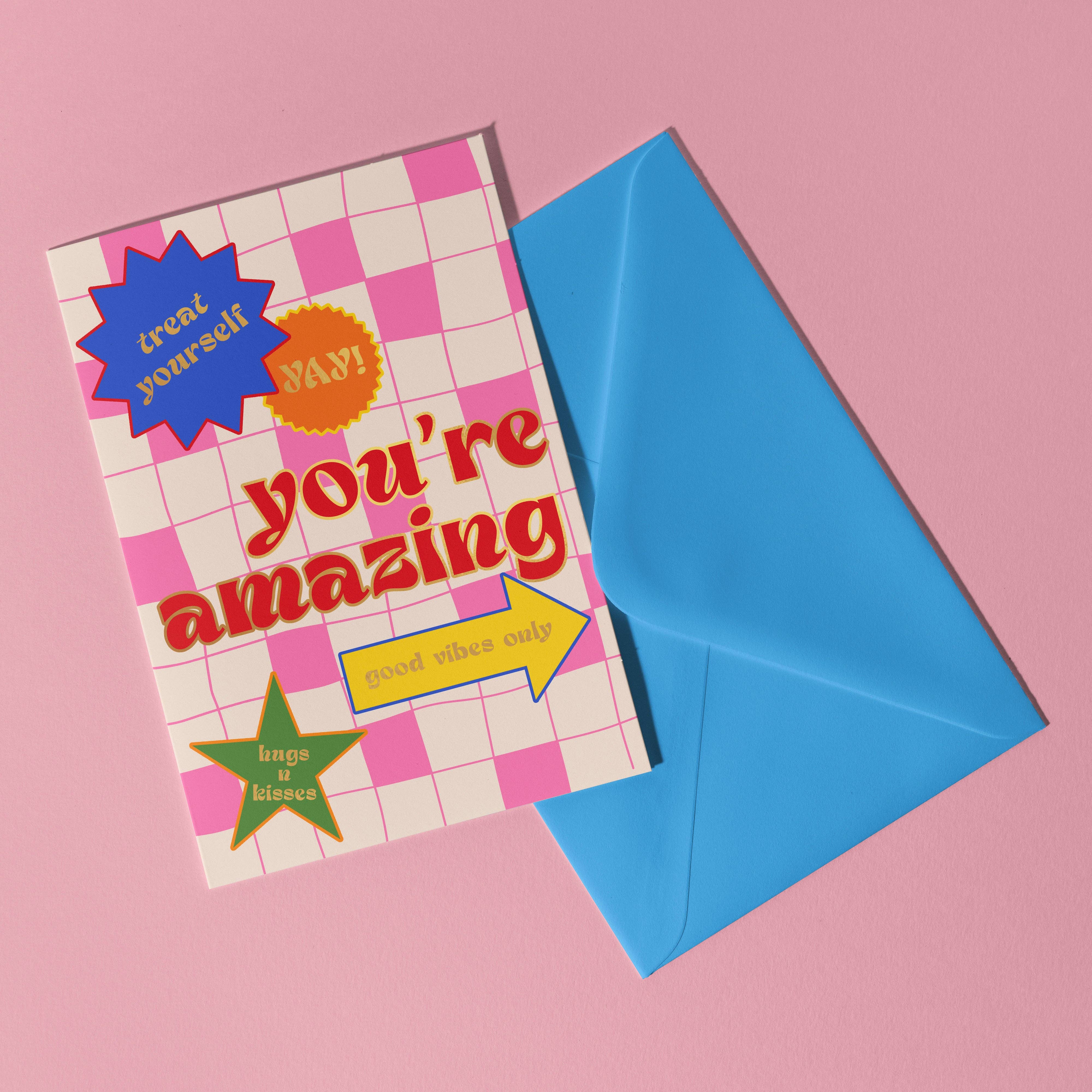 A6 Hugs Bubbles and Birthday CakeĀ Card with a traditional check print in pink and blue shades. Printed on the smoothest high quality card. Comes packaged in a compostable poly bag for protection.