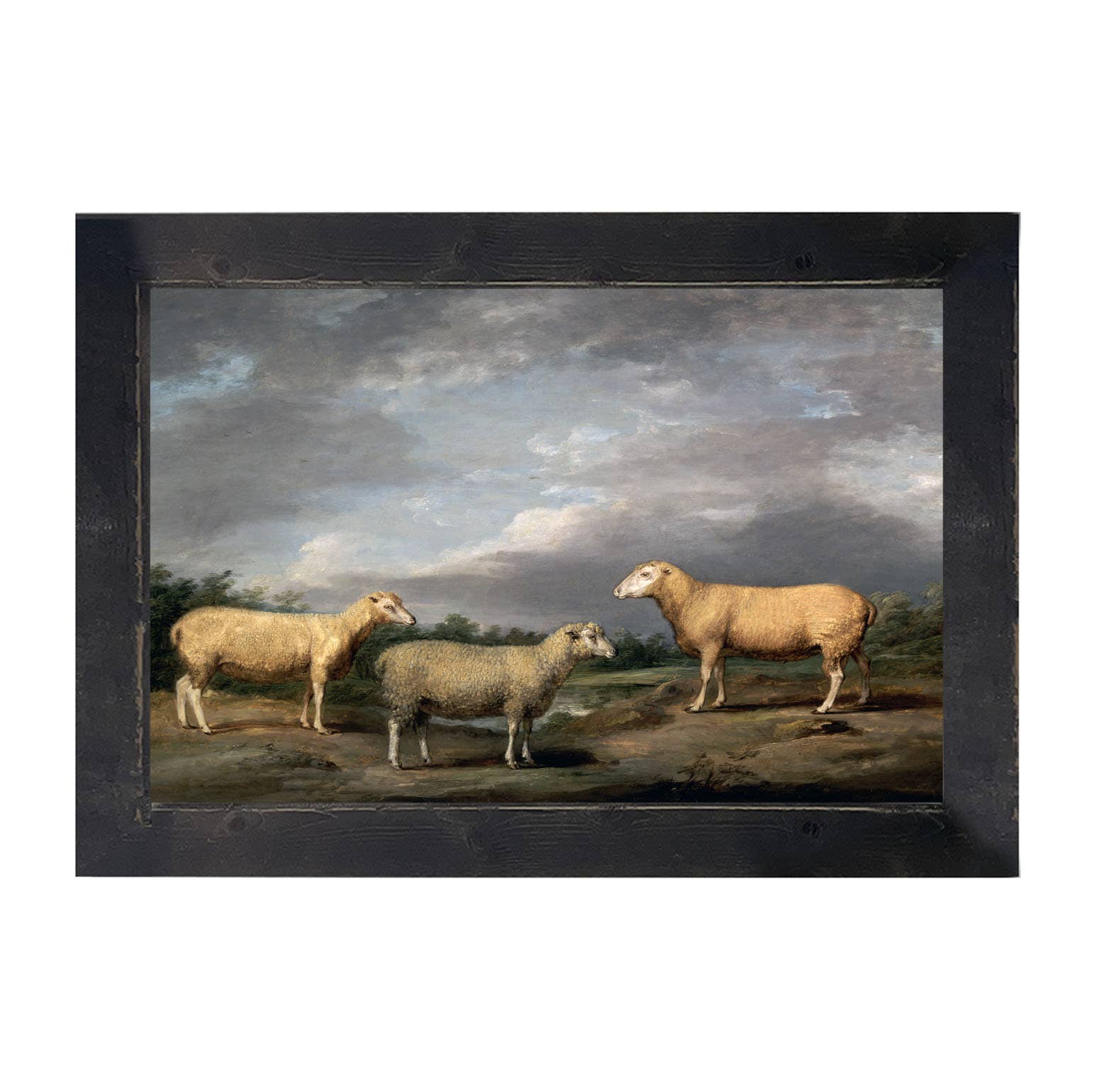 Framed vintage oil painting reproduction in wooden frame behind glass