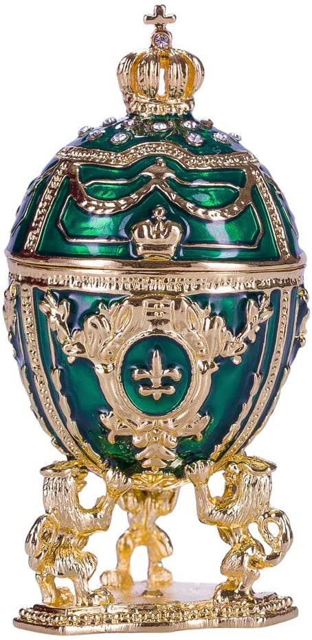 This egg is a small replica of the famous Imperial Coronation Faberge Egg. The Imperial Coronation Egg is a jewelled Fabergé egg made under the supervision of the jeweller Peter Carl Fabergé in 1897 by Fabergé ateliers, Mikhail Perkhin and Henrik Wigstrom. The egg was made to commemorate Tsaritsa, Empress Alexandra Fyodorovna. Inside the egg you can find a small carriage. The egg can be used as a trinket jewel box. Material: Alloy of non-ferrous metals, enamel, crystals. Height: 2.6'' (6.5 cm). Weight: 0.3 lbs (125 g).