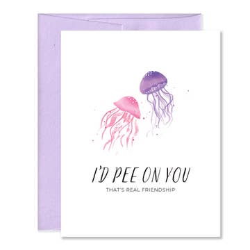 If You Got Stung by a Jellyfish I Would Pee On You by stonedonut design. There's friends that you would pee on in an emergency, and there are friends that you wouldn't. Be sure to let your BFF know which one they are. This design is printed on gorgeous polar matte photo card stock and if you choose the 5 x 7 option, it comes with an envelope included for convenience.