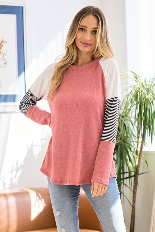This long sleeve top is made of a tri blend cotton material. Features a V neckline, a color block striped front and cuffs detail. This top is lightweight and easy to wear during spring time, the contrast color block stripes adds fun to this outfit. It is so playful that you can wear it with shorts, jeans or any bottom of your choice. Model/Picture information Height: 5'8 US Size: 2 Bust: 33" Waist: 25" ** Model wears a size small** *** ALL accessories are not included*** *MEXICO / USA PRODUCTION*
